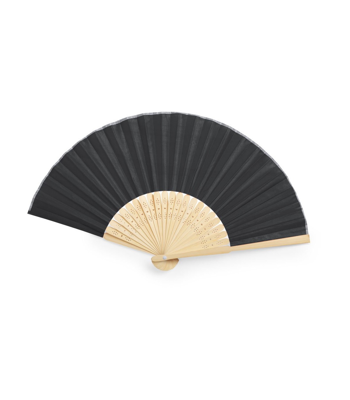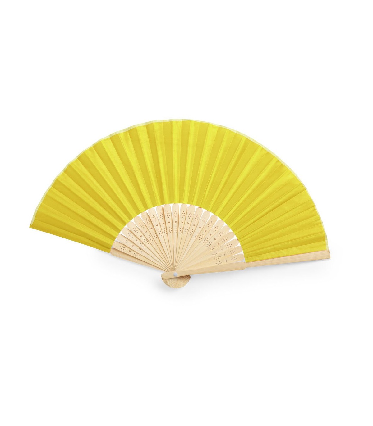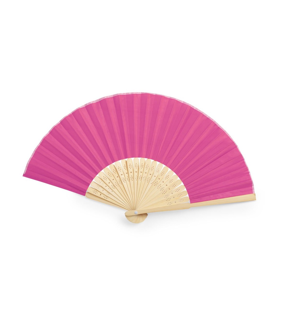 Abanico de varillas de bambú y tela en poliéster. Disponible en extensa gama de llamativos colores.