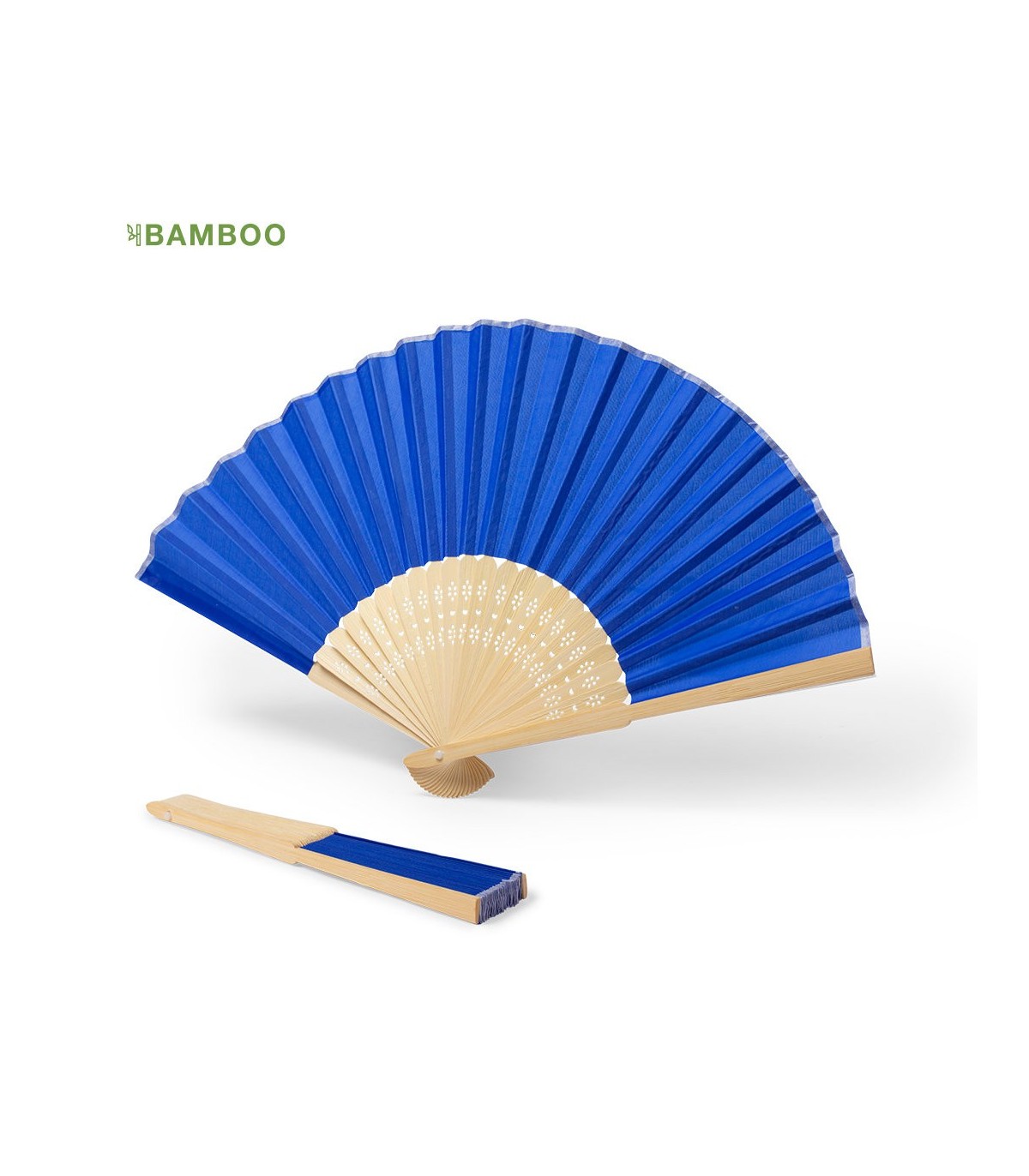 Original Abanico de varillas de bambú y tela en poliéster ideales para regalos ecológicos promocionales.