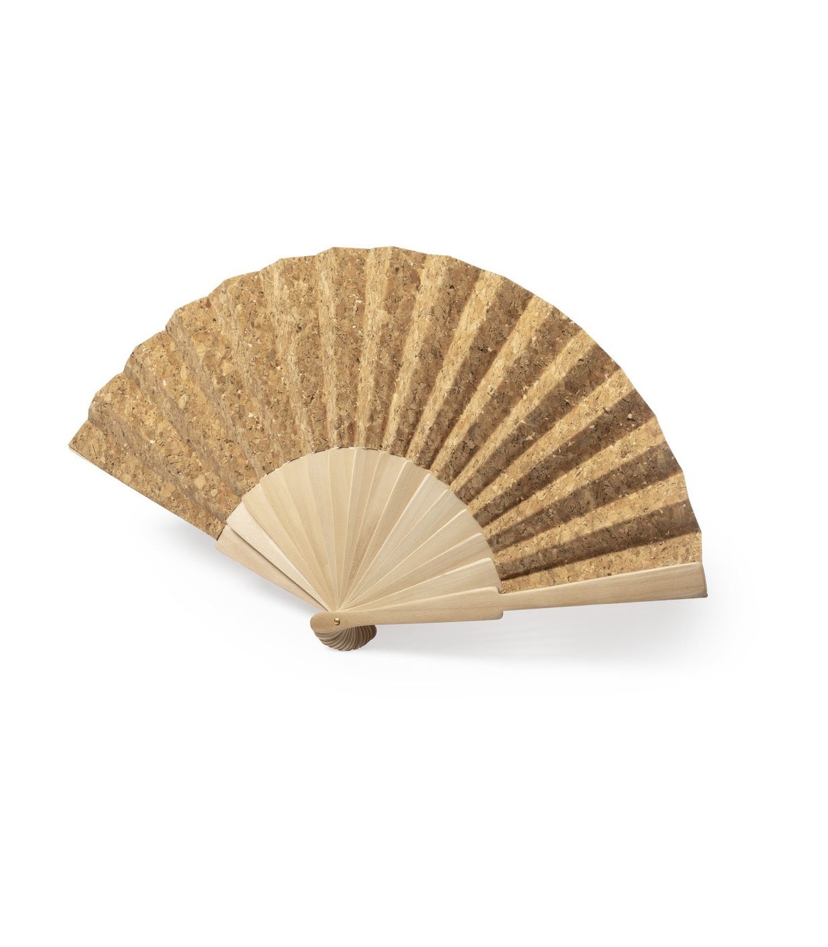 Abanico de fabricación ecológica, con varillas de madera y tela en corcho natural. Presentado en embalaje individual de diseño eco.