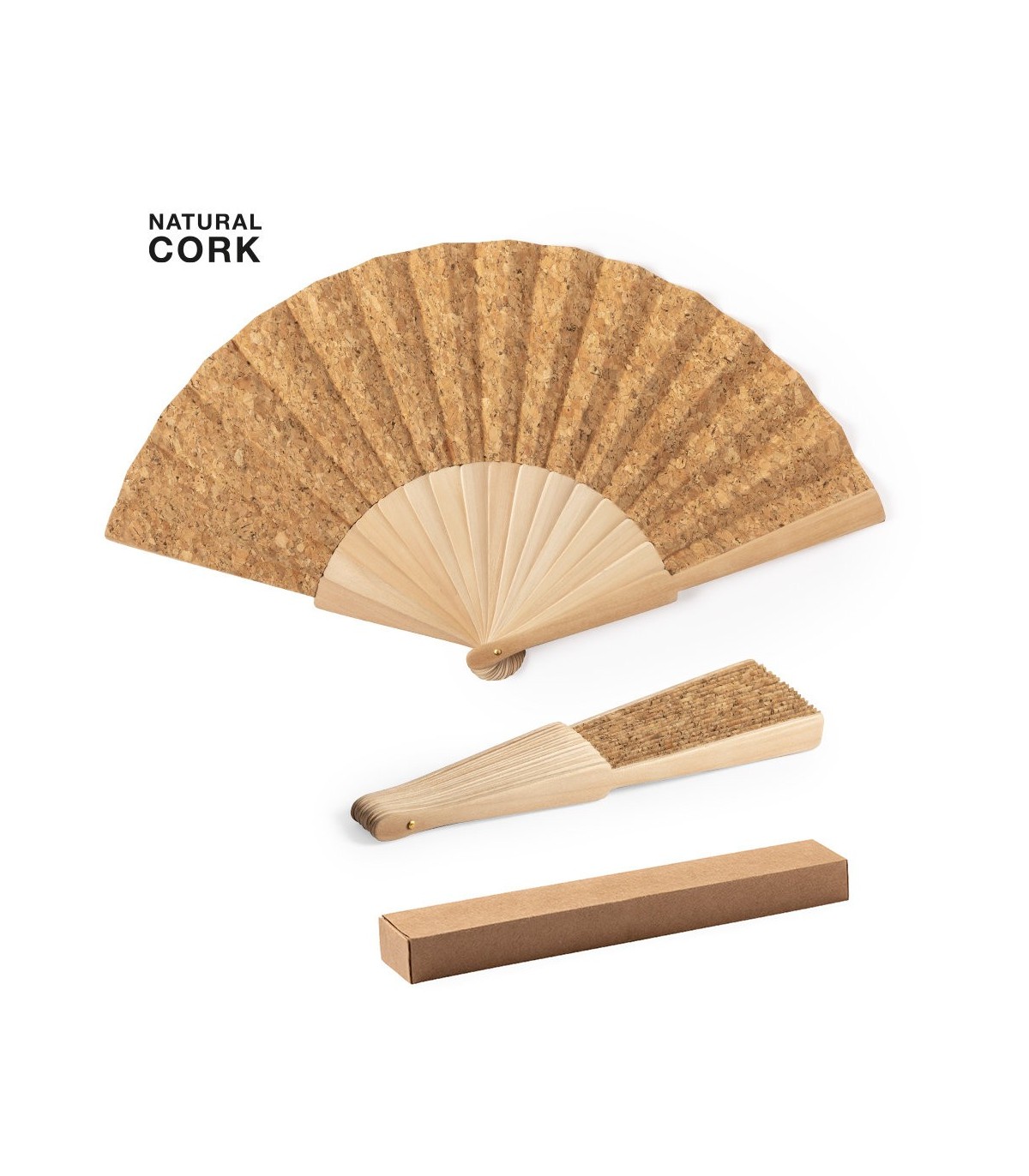 Abanicos con varillas de madera y tela en corcho natural, para regalos de empresa ecológicos. Presentado en caja individual de diseño eco.
