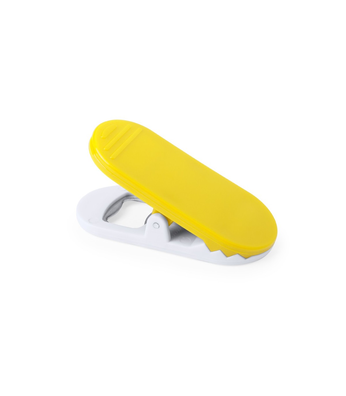 Abridor clip magnético con resistente cuerpo en diseño bicolor de variados colores y pieza de apertura metálica.