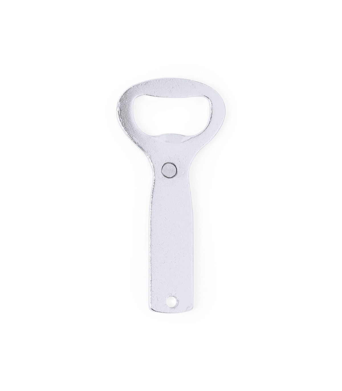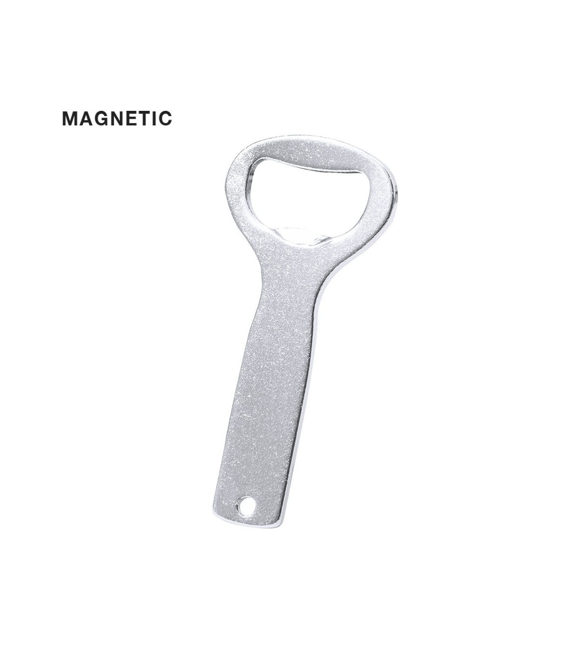 Sencillo y elegante abridor de botellas personalizados y fabricado en aluminio y con imán en el mango. Presentación individual en bolsa autocierre.