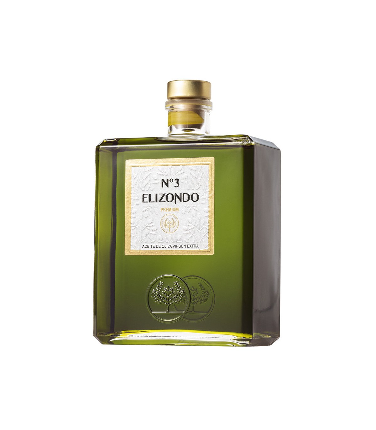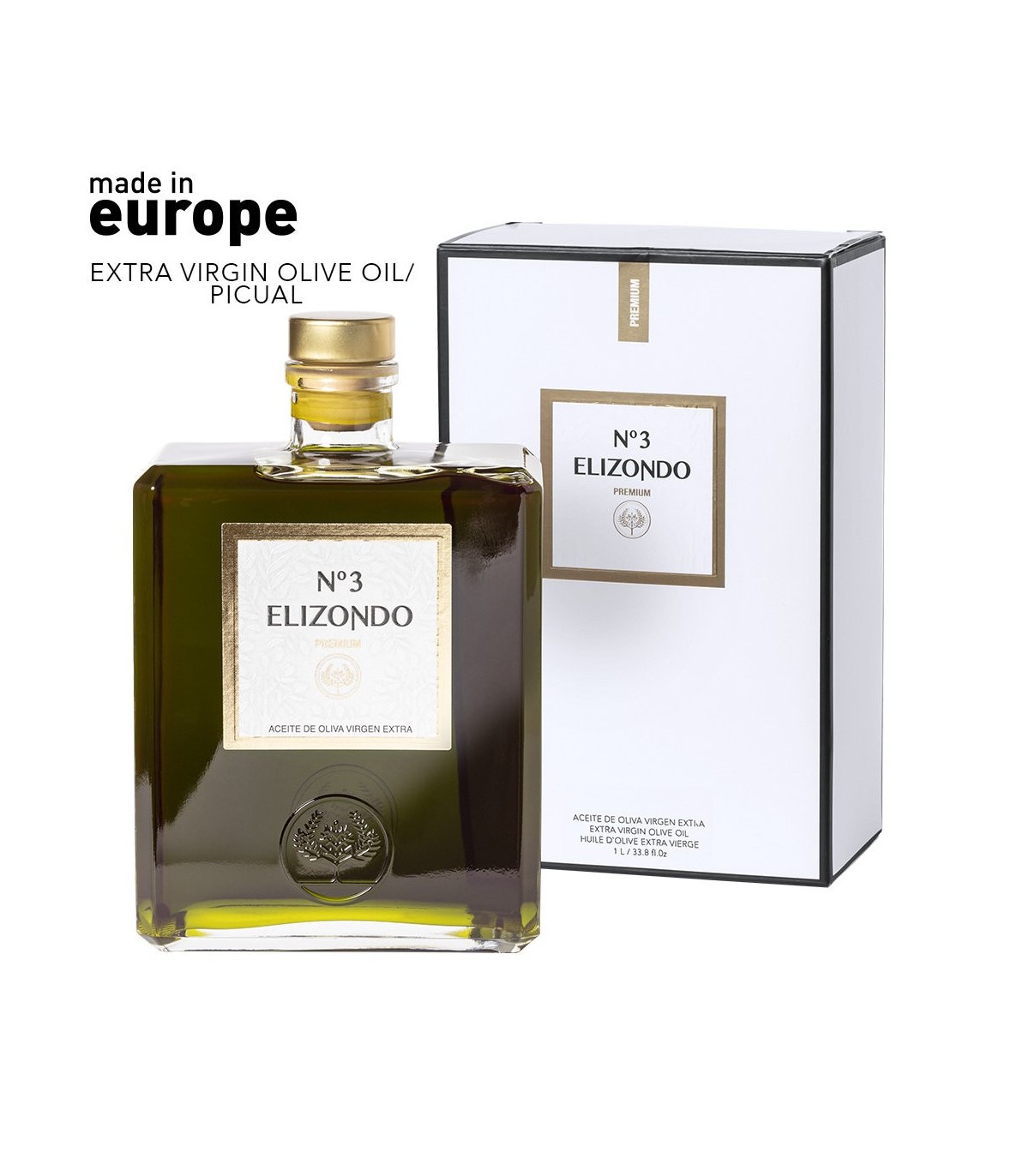 Aceite de oliva Elizondo Nº3 1L. Calidad Virgen Extra temprano y de variedad Picual, de un color verde intenso, recolectado en las primeras semanas de octubre, cuando las características organolépticas del fruto son óptimas, de extracción en frío. Fabricación española y presentado en botella de cristal de diseño con tapón de seguridad. Caja individual exclusiva con amplia superficie de marcaje.