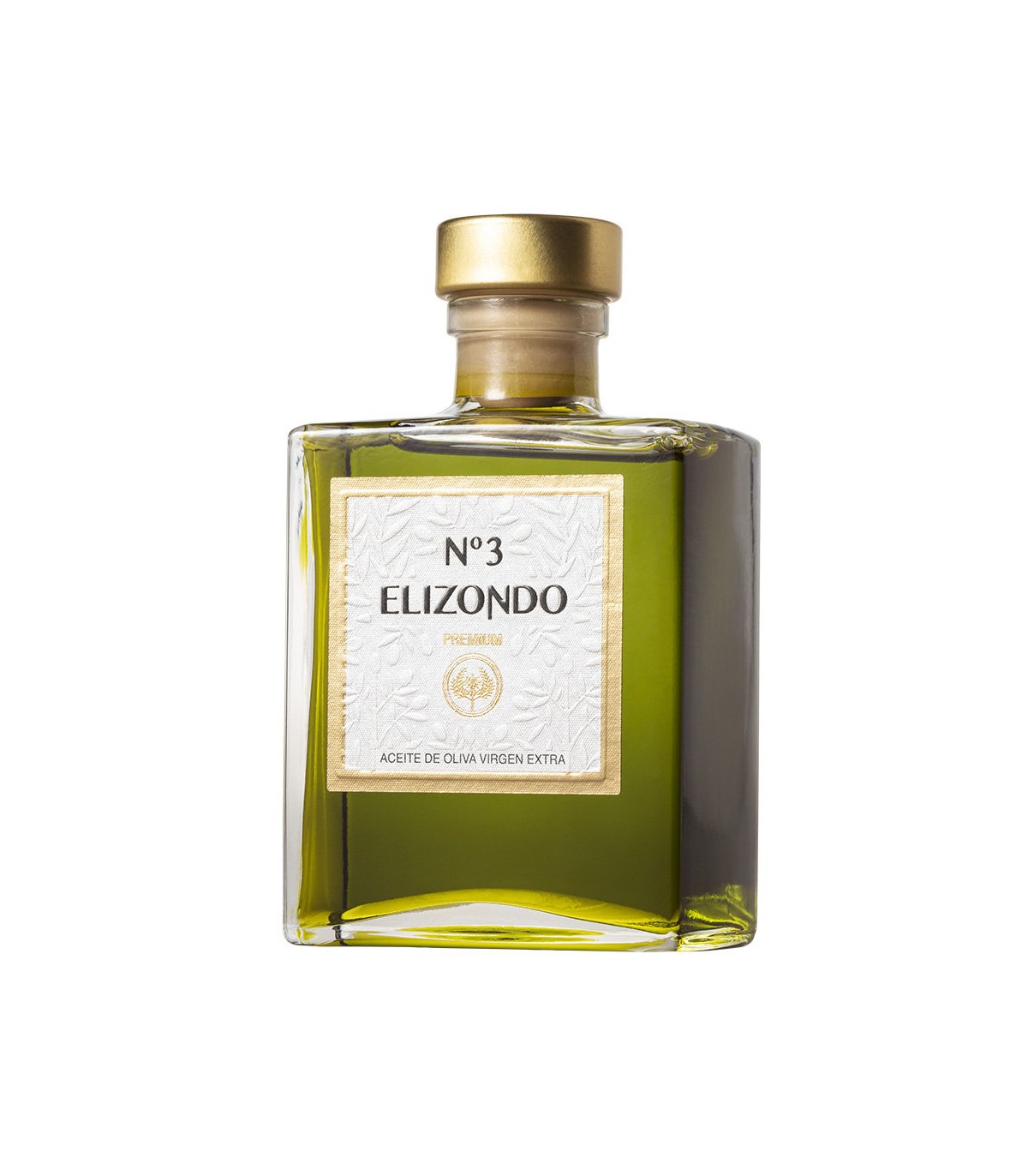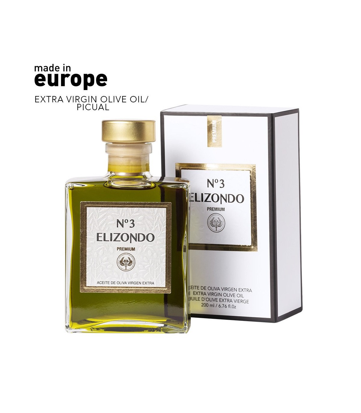 Aceite de oliva Elizondo Nº3 200ml. Calidad Virgen Extra temprano y de variedad Picual, de un color verde intenso, recolectado en las primeras semanas de octubre, cuando las características organolépticas del fruto son óptimas, de extracción en frío. Fabricación española y presentado en botella de cristal de diseño con tapón de seguridad. Caja individual exclusiva con amplia superficie de marcaje.