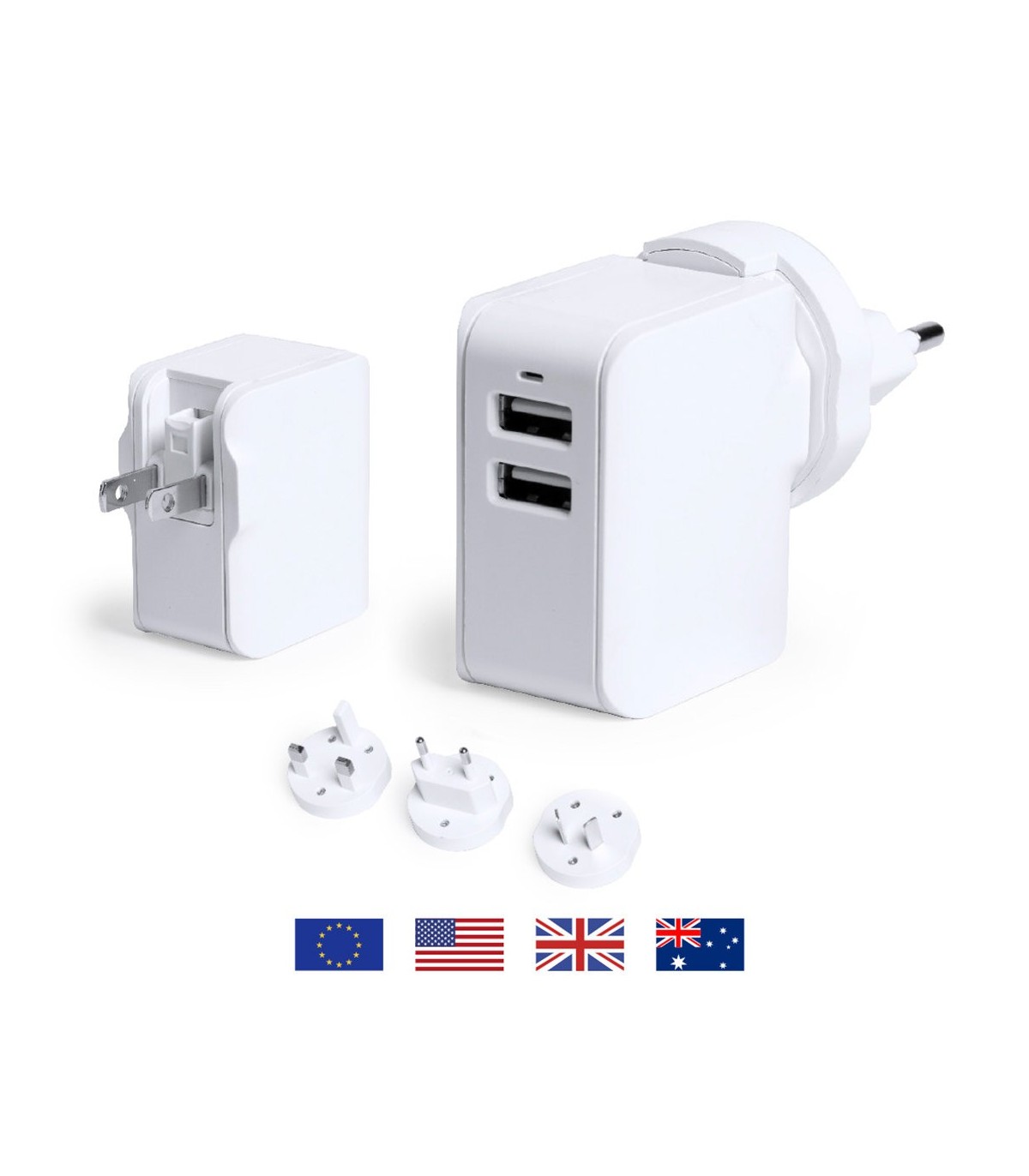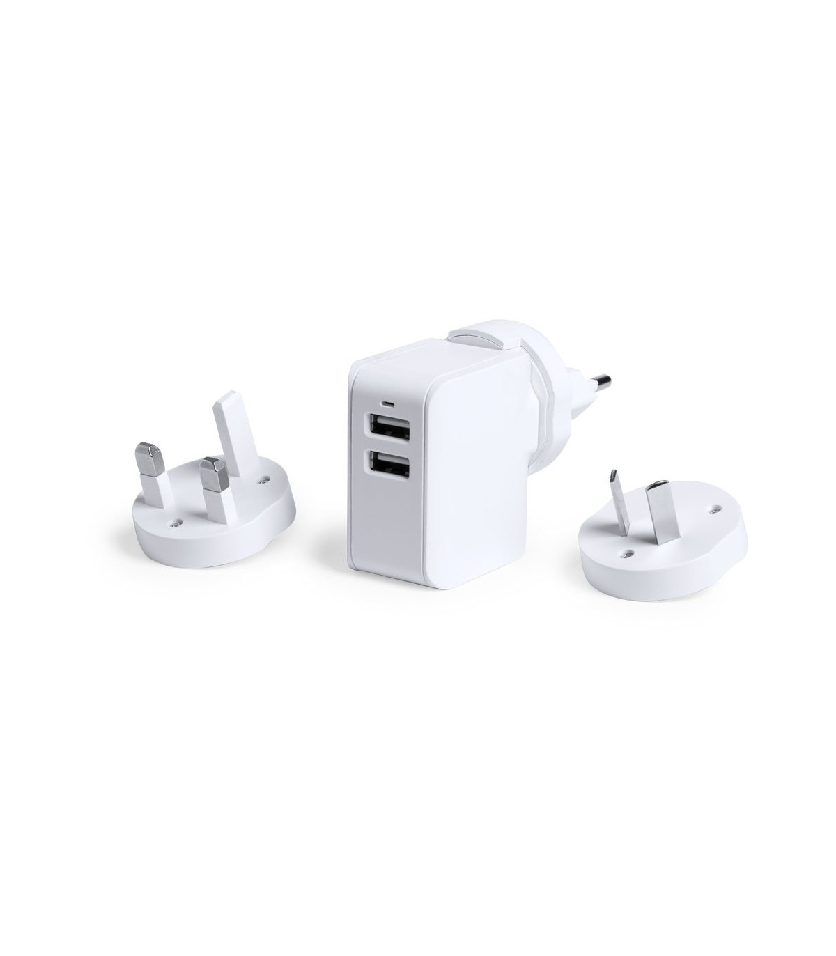 Adaptador viaje/oficina con doble salida USB. De elegante diseño en color blanco y amplia superficie de marcaje. 2 salidas USB de 2.400 mA, con LEDs indicadores y adaptadores de enchufe de pared para USA, Europa, Asia, Reino Unido y Australia. Presentado en funda protectora y en atractiva caja de diseño.