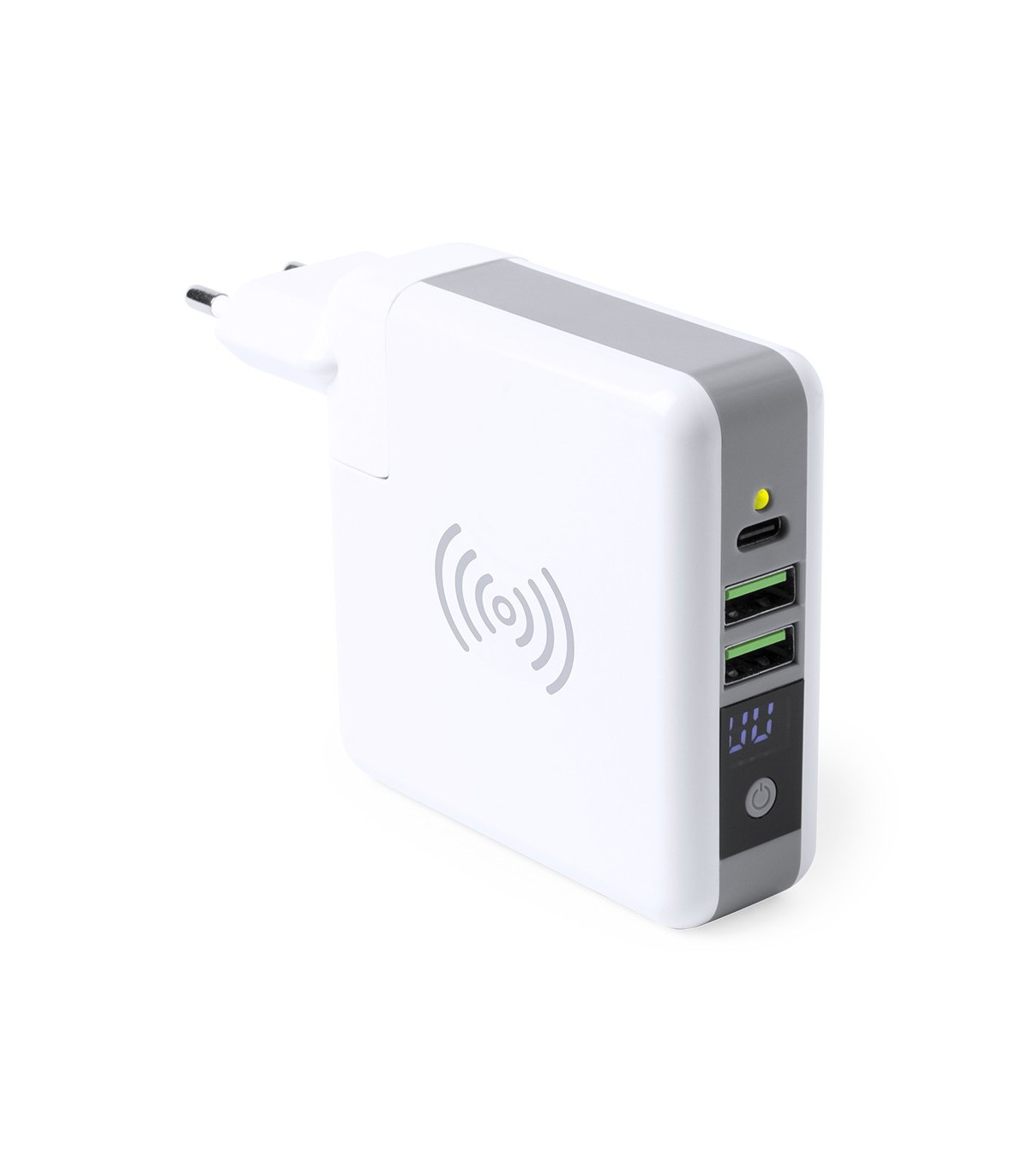 Adaptador viaje inalámbrico, multifunción y multisalida con powerbank integrado de 6.700 mAh de capacidad de carga. De elegante diseño en color blanco y amplia superficie de marcaje. Función de carga inalámbrica, conexión dual de entrada y salida de corriente Tipo-C de 3.000 mA y 2 salidas USB de 2.400 mA. Pantalla LCD con indicador de estado de carga y adaptadores de enchufe de pared para USA, Europa, Asia, Reino Unido y Australia. Simultaneidad de uso para todas las funciones. Presentado en atractiva caja de diseño.