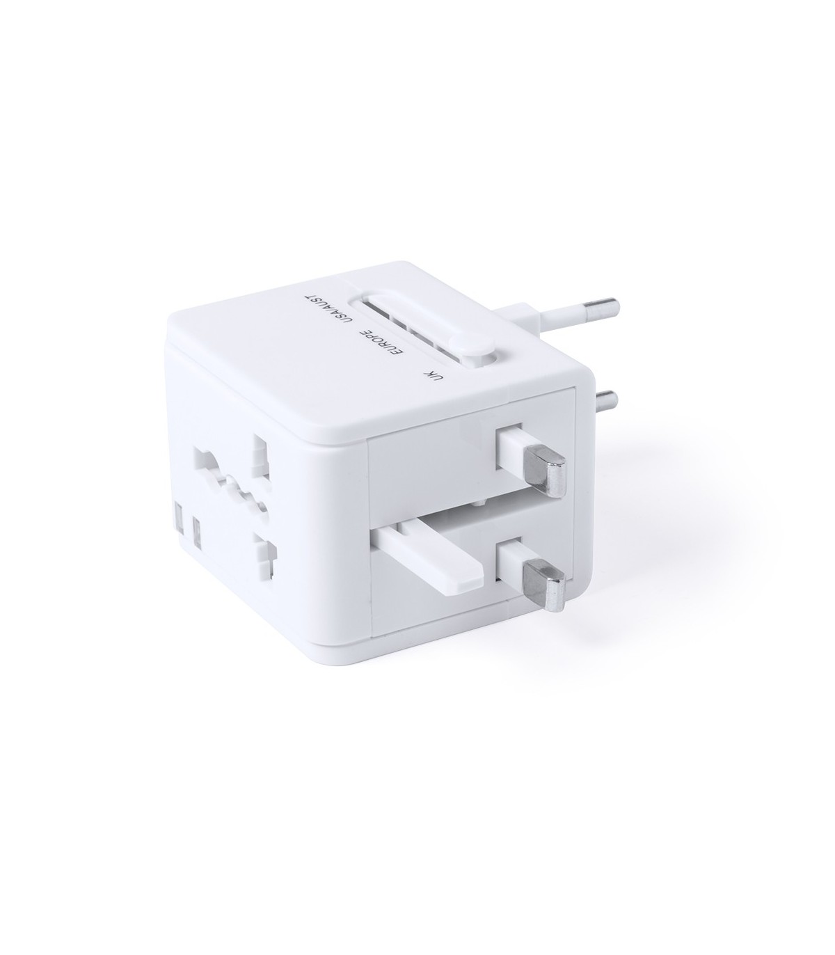 Adaptador para enchufes en con conectores para diferentes países ( Europa - Usa - Asia - Reino unido) con 2 salidas USB y 2100 mA, Color blanco y personalizado para obsequios de empresas originales.