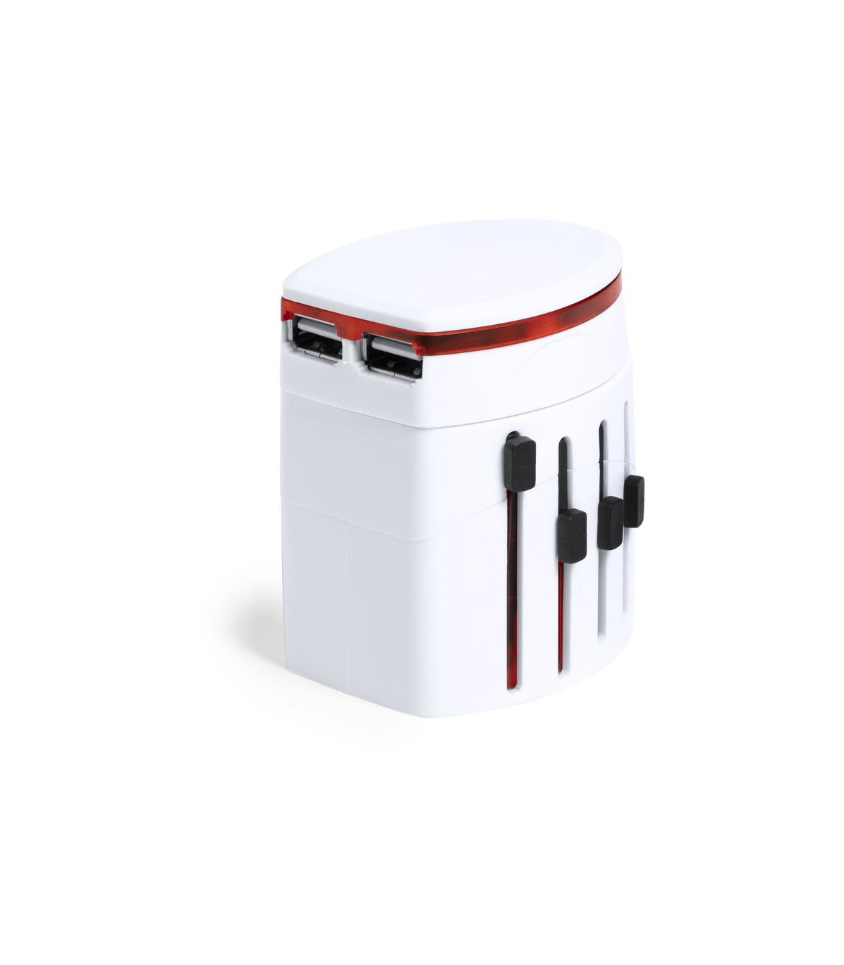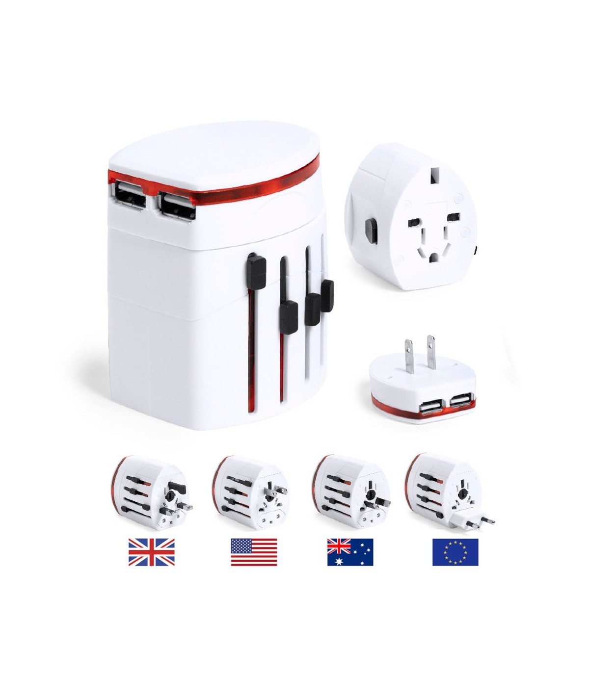 Adaptador viaje/oficina con doble salida USB. De elegante diseño bicolor y amplia superficie de marcaje. 2 salidas USB de 2.100 mA, capaz de cargar hasta dos dispositivos de manera simultánea, e ingenioso sistema retráctil para enchufes de pared: USA, Europa, Asia, Reino Unido y Australia. Presentado en atractiva caja de diseño.