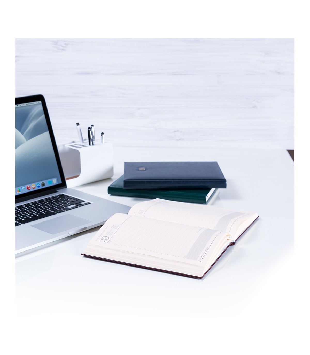 Agenda de tamaño B5 acabada en resistente y suave polipiel con acolchado y en sobrios colores. Diseño página día con frase del día y marcapáginas de tela. En castellano, inglés, francés, italiano, portugués, gallego, euskera y catalán.