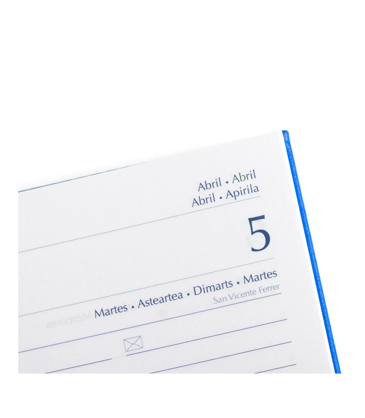 Agenda de anillas tamaño B5, acabada en resistente y suave polipiel de variados colores. Diseño página día con frase del día. En castellano, gallego, euskera y catalán. Presentada en caja individual.