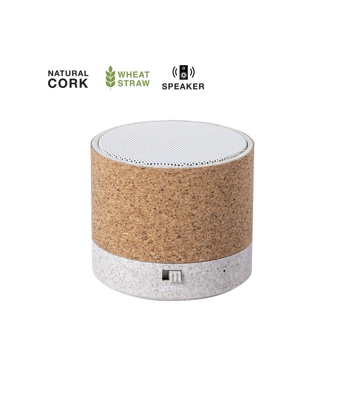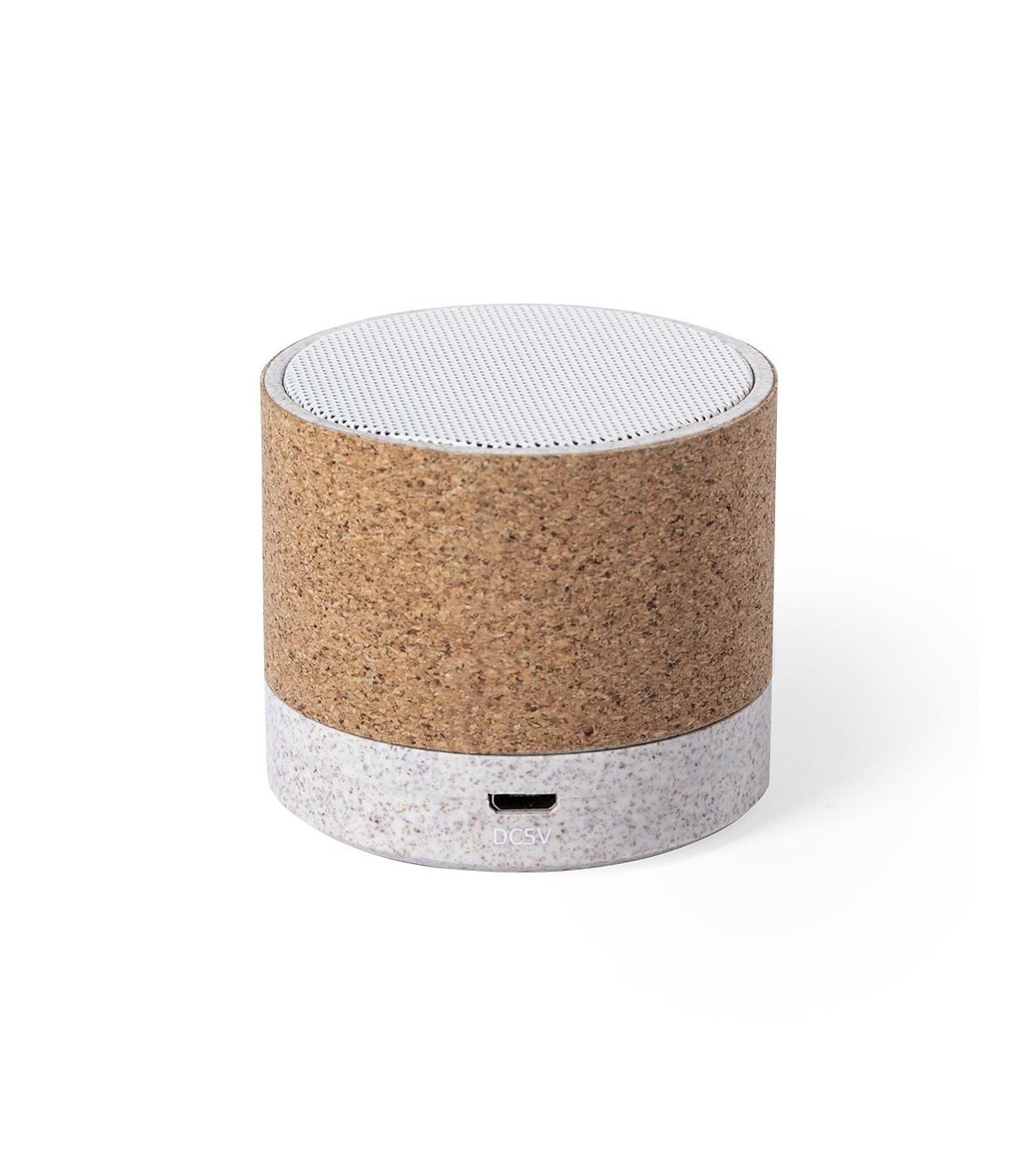 Compacto altavoz de línea ecológica y conexión Bluetooth® 5.0. Carcasa en combinación de materiales corcho natural y caña de trigo, para así fomentar la utilización de materias primas naturales y reducir las emisiones contaminantes. Ofrece 3W de potencia, con cable micro USB incluido y base antideslizante. Presentado en atractiva caja de diseño eco.