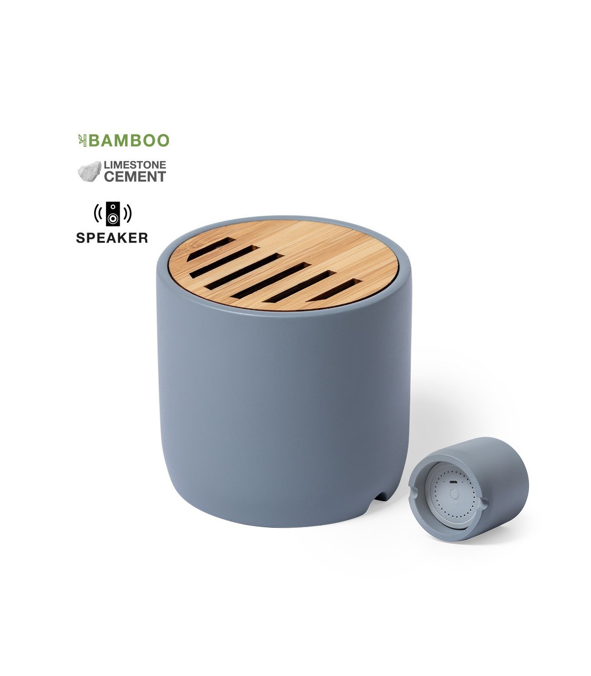 Altavoz Bluetooth en combinación de piezas de bambú de corte nature y cemento de piedra caliza, un conglomerante formado por la mezcla de materiales naturales, principalmente piedra caliza molida y agua, obteniendo un material de gran consistencia y durabilidad. De tamaño compacto, con conexión Bluetooth® 5.0 y 3W de potencia. Compatible con iOS y Android, incluye cable de carga micro USB y viene presentado en atractiva caja de diseño. Disponible manual de instrucciones español e inglés.