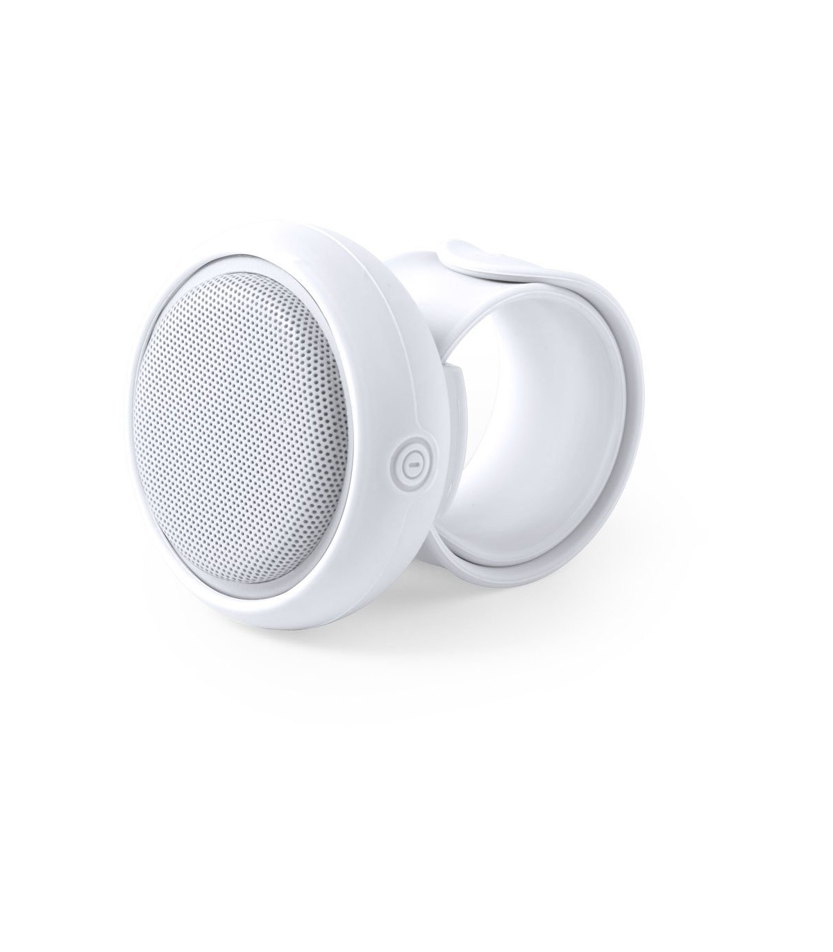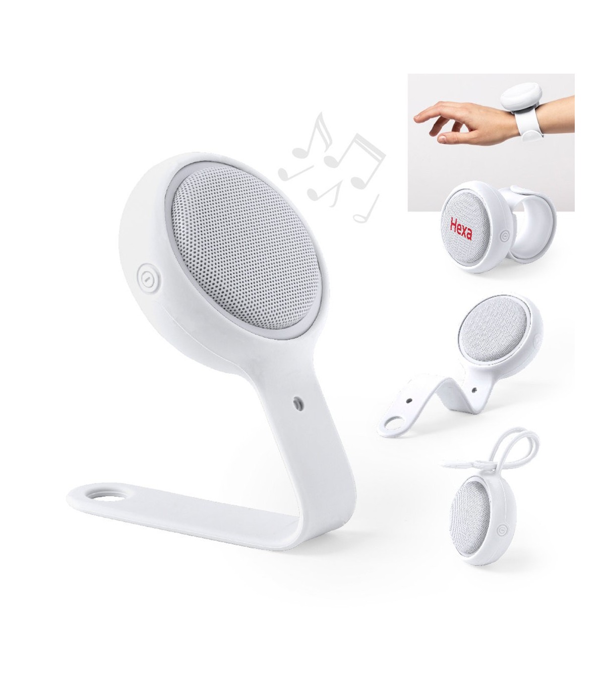 Altavoz Bluetooth® con función manos libres. Con 3 accesorios de silicona: ajuste en muñeca con pulsera, accesorio para colgar y soporte flexible multi posición.