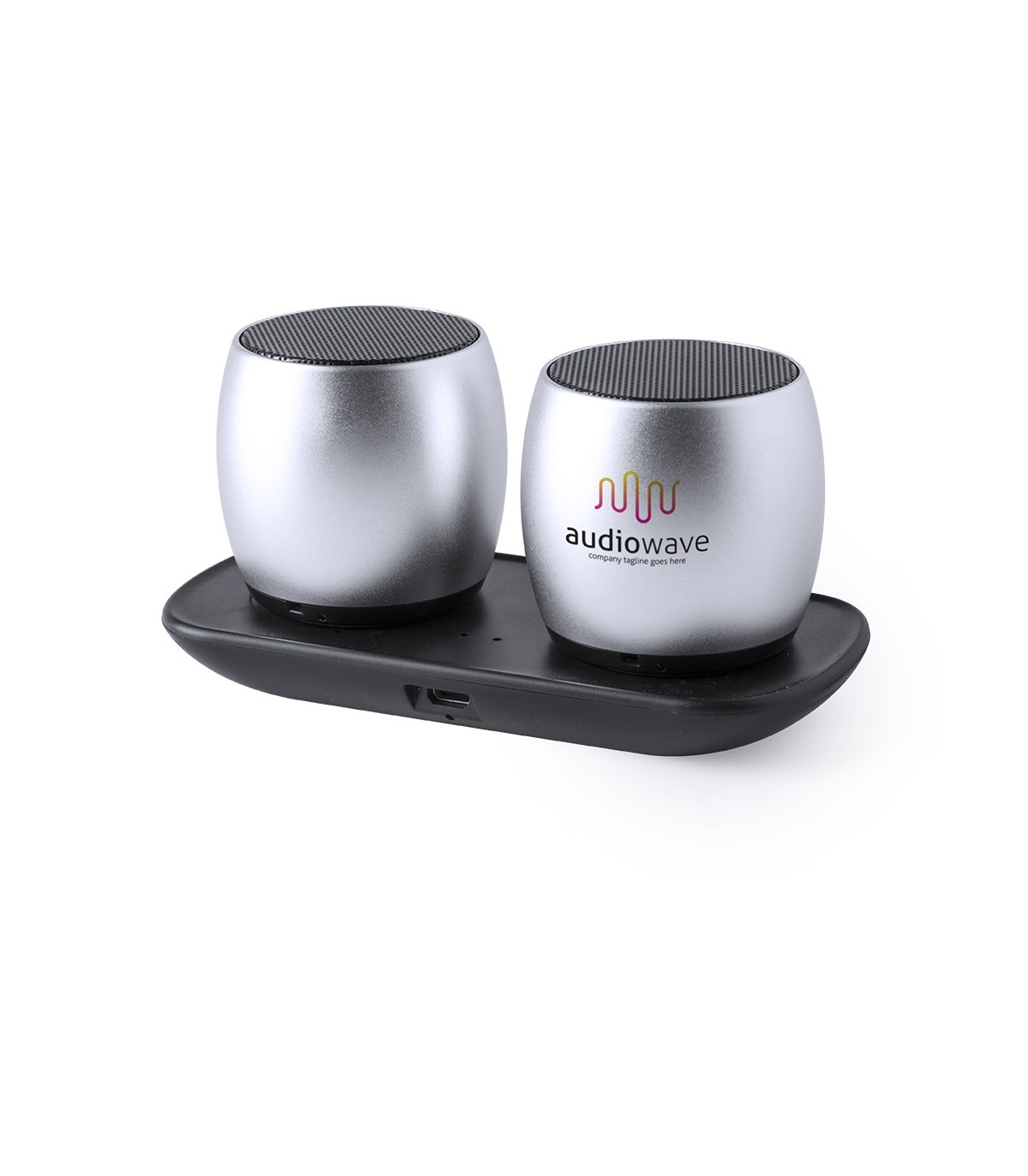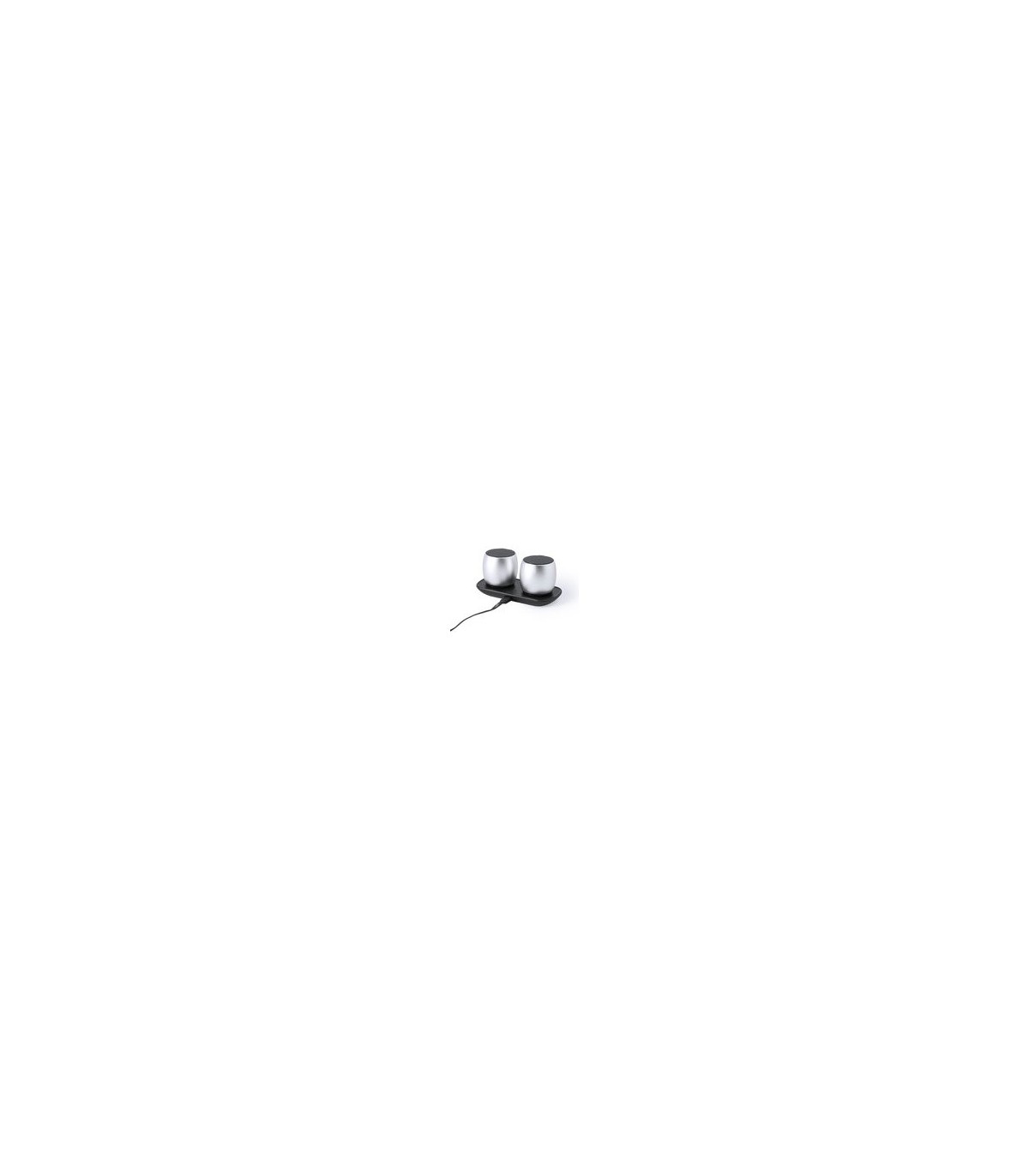 Altavoces promocionales con conexión Bluetooth, con rejilla metálica y base recargable mediante cable USB -incluido-. Potencia 2x3W y sonido impactante.