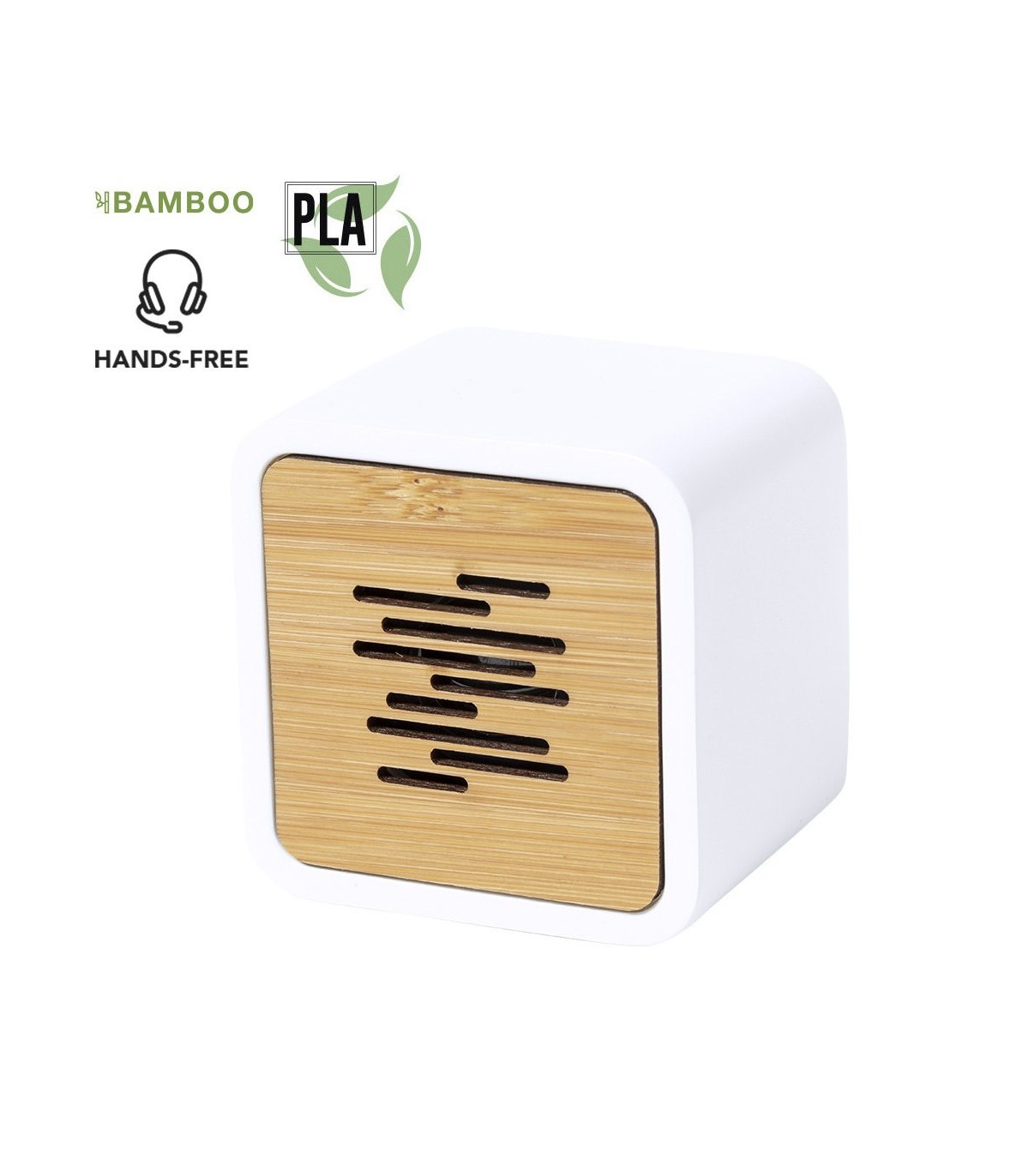 Altavoz de elaboración ecológica y conexión Bluetooth® 5.0. Fabricado en combinación de bambú y PLA -Ácido PoliLáctico-, que se obtiene a partir de recursos 100% naturales como el almidón de maíz, la yuca o la caña de azúcar, pudiendo convertirse en 100% compostable al final de su ciclo de vida útil. 3W de potencia, con función manos libres y recargable mediante cable USB -incluido-. Presentado en atractiva caja de diseño eco. Distintivo PLA sobre el artículo.