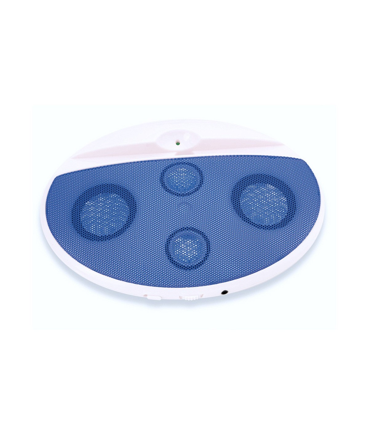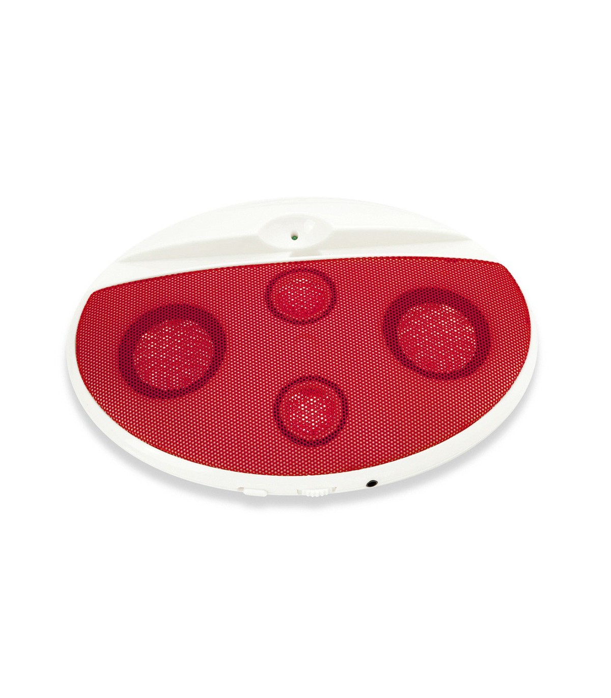 Altavoz conexión jack 3,5 mm potencia 2w con 4 altavoces, utiliza pilas AAA que no van incluidas, sirve como soporte para el móvil, disponible en blanco con la rejilla de los altavoces en diferentes colores.