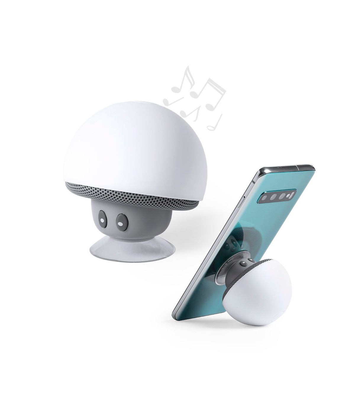 Originales altavoces promocionales, diseño de seta con soporte para móvil. Conectividad Bluetooth® 5.0, con 3W de potencia y función manos libres. Cable micro USB incluido.