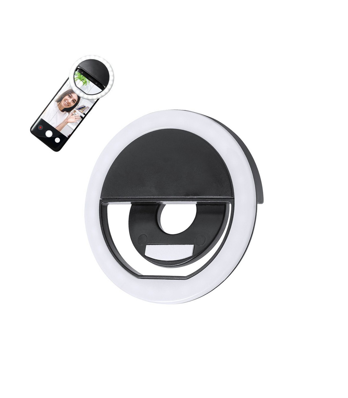 Anillo de luz led con acople para smartphone, con 28 ledes y 3 niveles de intensidad y recargable por USB (cable Micro USB incluido). Ideales para regalos de empresa