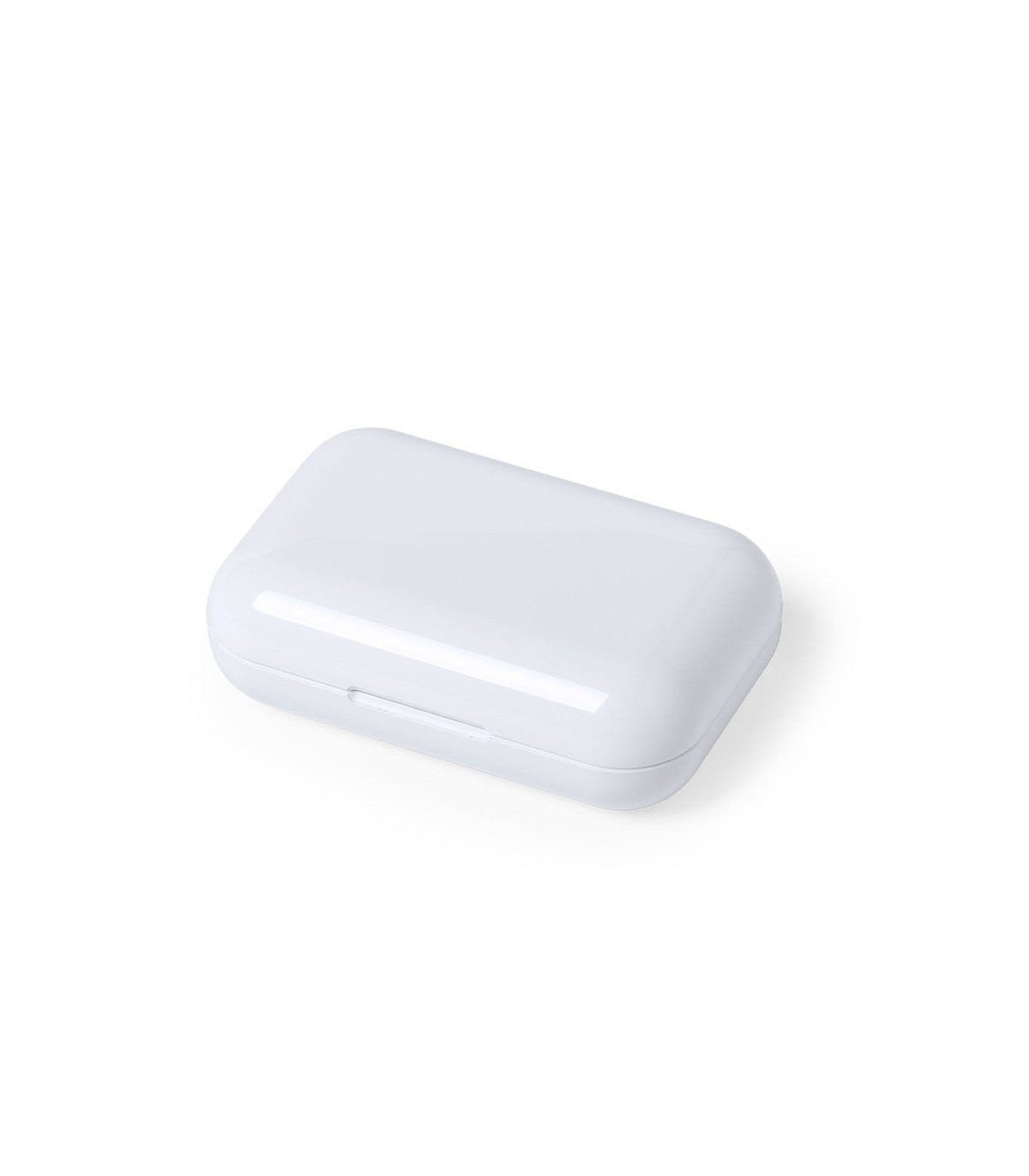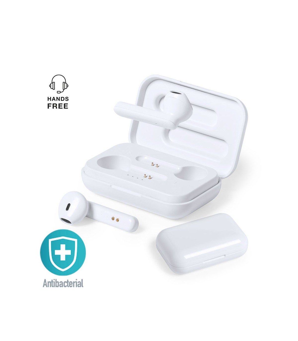Auriculares antibacterianos intraurales en elegante acabado blanco y conexión Bluetooth® 5.0. Fabricados en resistente material ABS brillo y de diseño ergonómico, incluyen botón de control táctil integrado en el auricular, con base de carga a juego. Función manos libres y recargables, con cable micro USB incluido. Presentados en estuche individual de lujo con tapa de bisagra y en atractiva caja de diseño. Los productos con tratamientos antibacterianos son capaces de reducir drásticamente las cargas bacterianas presentes en las superficies de los materiales, gracias a la incorporación de agentes microbianos permanentes estáticos, con alta efectividad para inhibir y prevenir la contaminación bacteriana. Artículo de acuerdo al estándar ISO 22196, que determina la actividad antibacteriana en materiales plásticos y superficies no porosas, lo que permite conocer la efectividad de inhibición microbiana que tienen los aditivos sobre los objetos tratados mediante una evaluación cuantitativa.