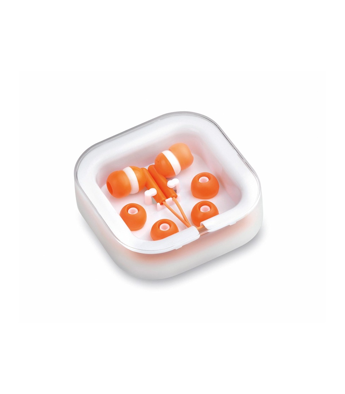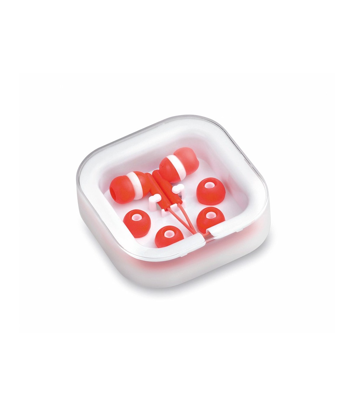 Prácticos y confortables auriculares intraurales de desenfadado diseño bicolor, conexión jack de 3,5mm y cable en color a juego. Presentados en elegante estuche de diseño y con almohadillas de recambio.