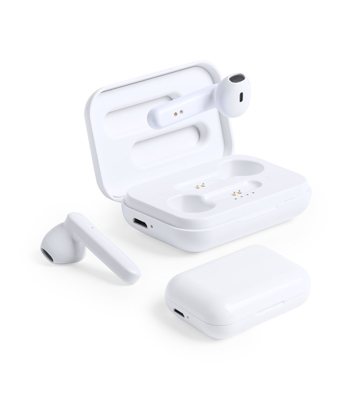 Auriculares intraurales en elegante acabado blanco y conexión Bluetooth® 5.0. De diseño ergonómico, incluyen botón de control táctil integrado en el auricular, con base de carga a juego. Función manos libres y recargables, con cable micro USB incluido. Presentados en estuche individual de lujo con tapa de bisagra y en atractiva caja de diseño.