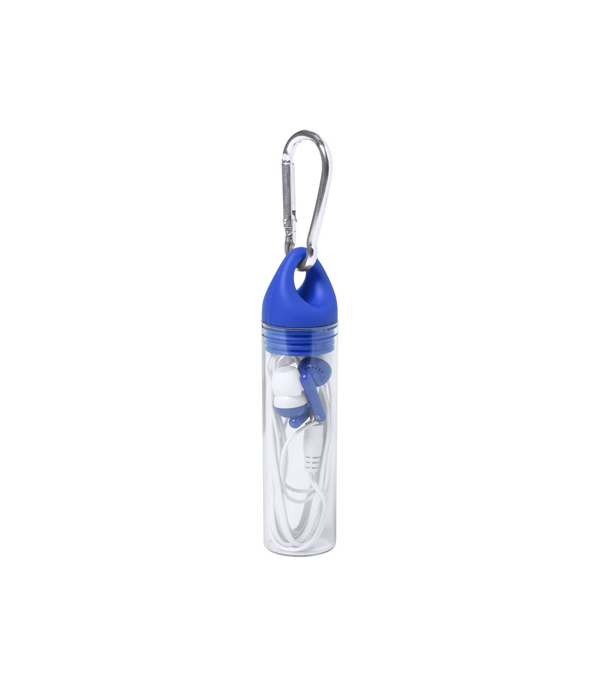 Auriculares intraurales de diseño bicolor, conexión jack de 3,5mm y cable en color blanco. Con pastillas en variada gama de colores diseñadas para marcaje en tampografía y presentados en original estuche transparente cilíndrico con mosquetón de transporte y tapa con rosca a juego.