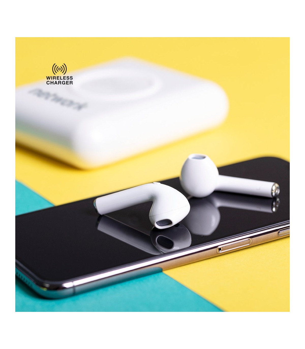 Set de auriculares intraurales con batería auxiliar externa y carga inalámbrica o por cable de 5.200 mAh de capacidad y conexión de entrada Tipo C. Recargables mediante puerto USB -cable incluido- y base con tapa de bisagra.