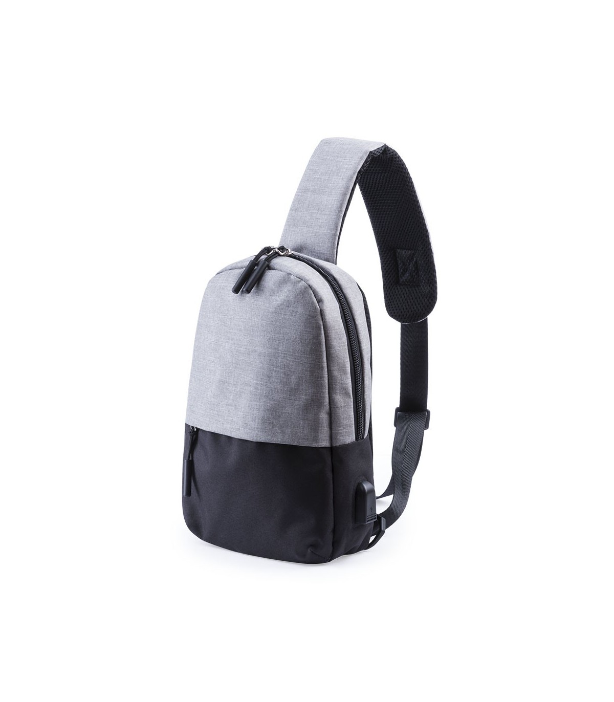Bandolera multiusos en resistente poliéster 300D. De atractivo diseño urbano, en combinación de colores gris denim y negro. Con conexión USB para carga -powerbank y cable no incluídos- y bolsillo acolchado para tablet de hasta 10 pulgadas. Espalda y cinta acolchadas, con cinta de ajuste regulable. Bolsillo principal de fácil apertura, con cierre de cremallera y resistentes tiradores.