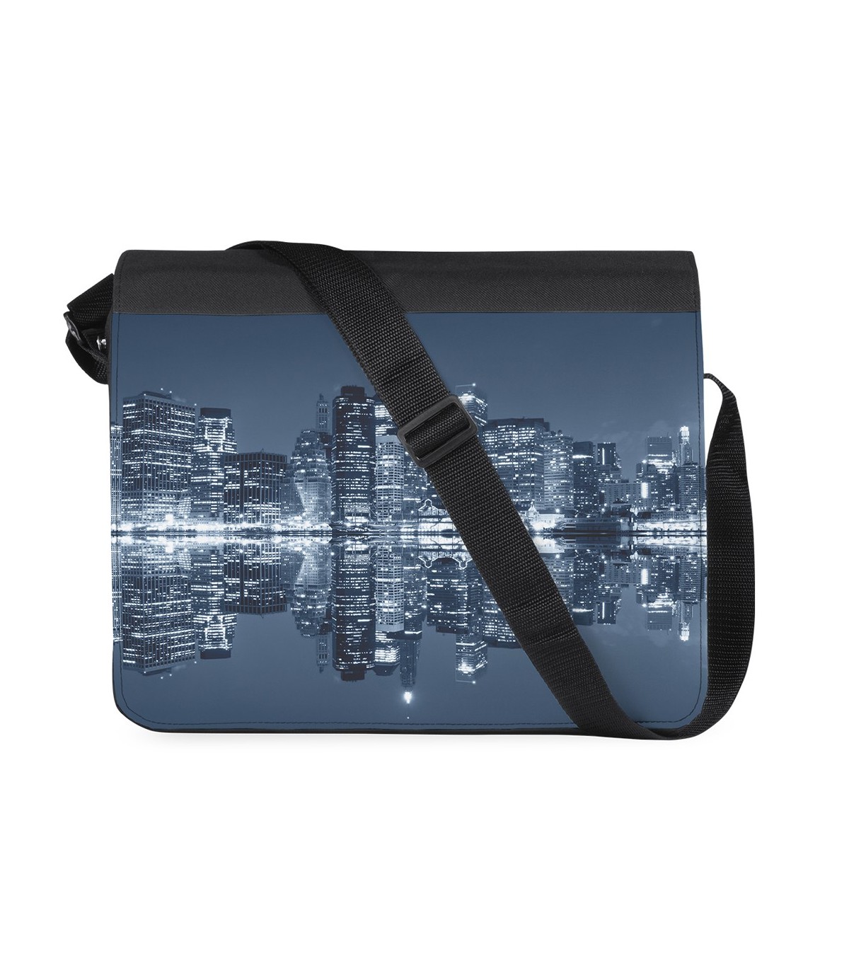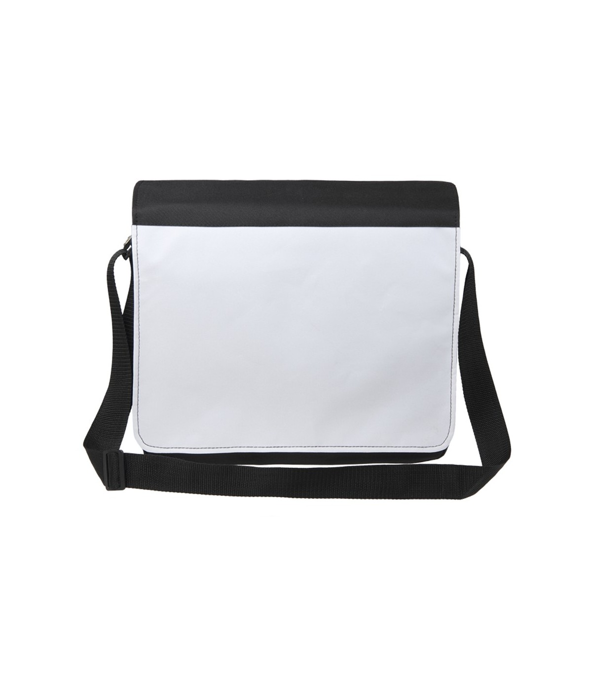 Bandolera con solapa de cierre de velcro en elegante poliéster 600D en combinación de colores negro y blanco especialmente diseñada para marcaje en sublimación. Bolsillo exterior trasero con cierre de cremallera, interior con bolsillo de rejilla y cinta bandolera con accesorio de ajuste.