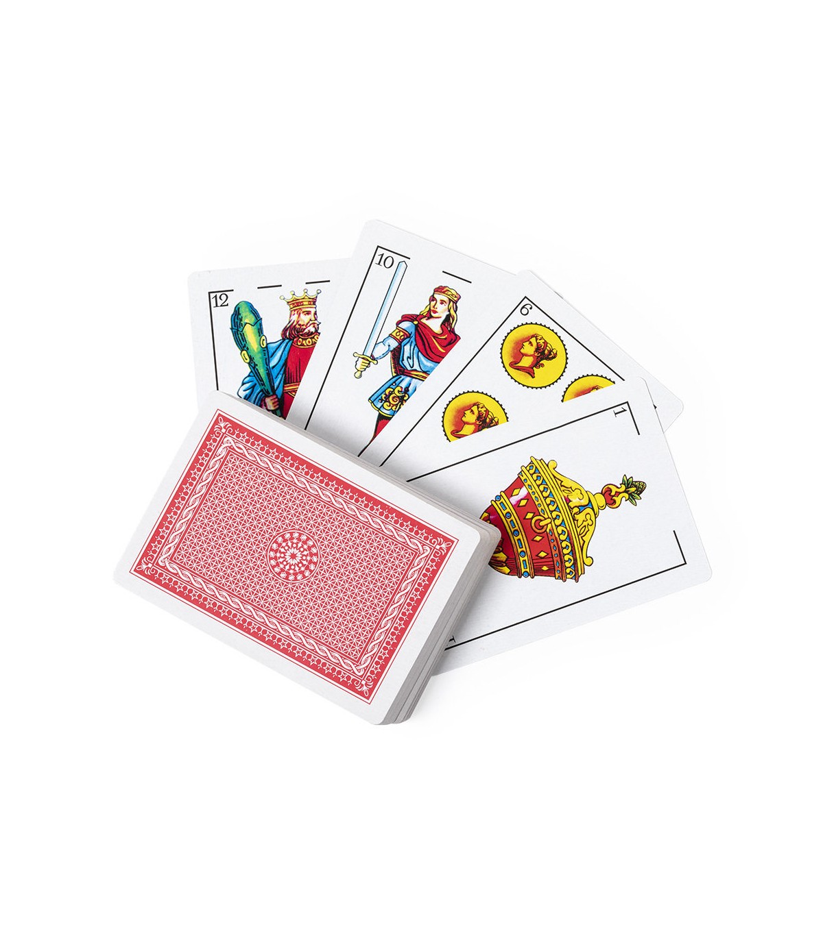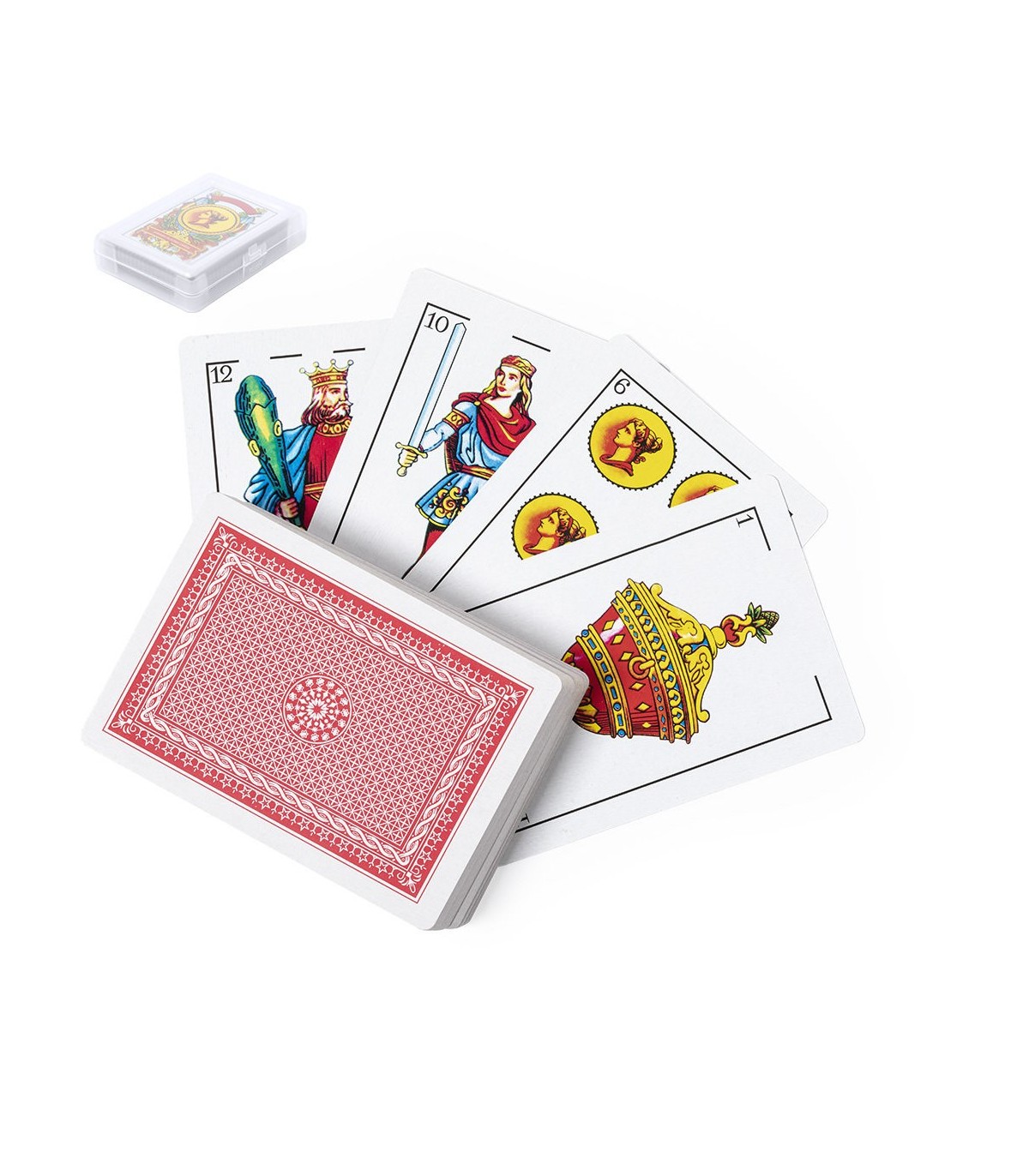 Baraja española elaborada en resistente papel laminado. Incluye 50 naipes, presentados en estuche individual de acabado translúcido y con cierre de seguridad.