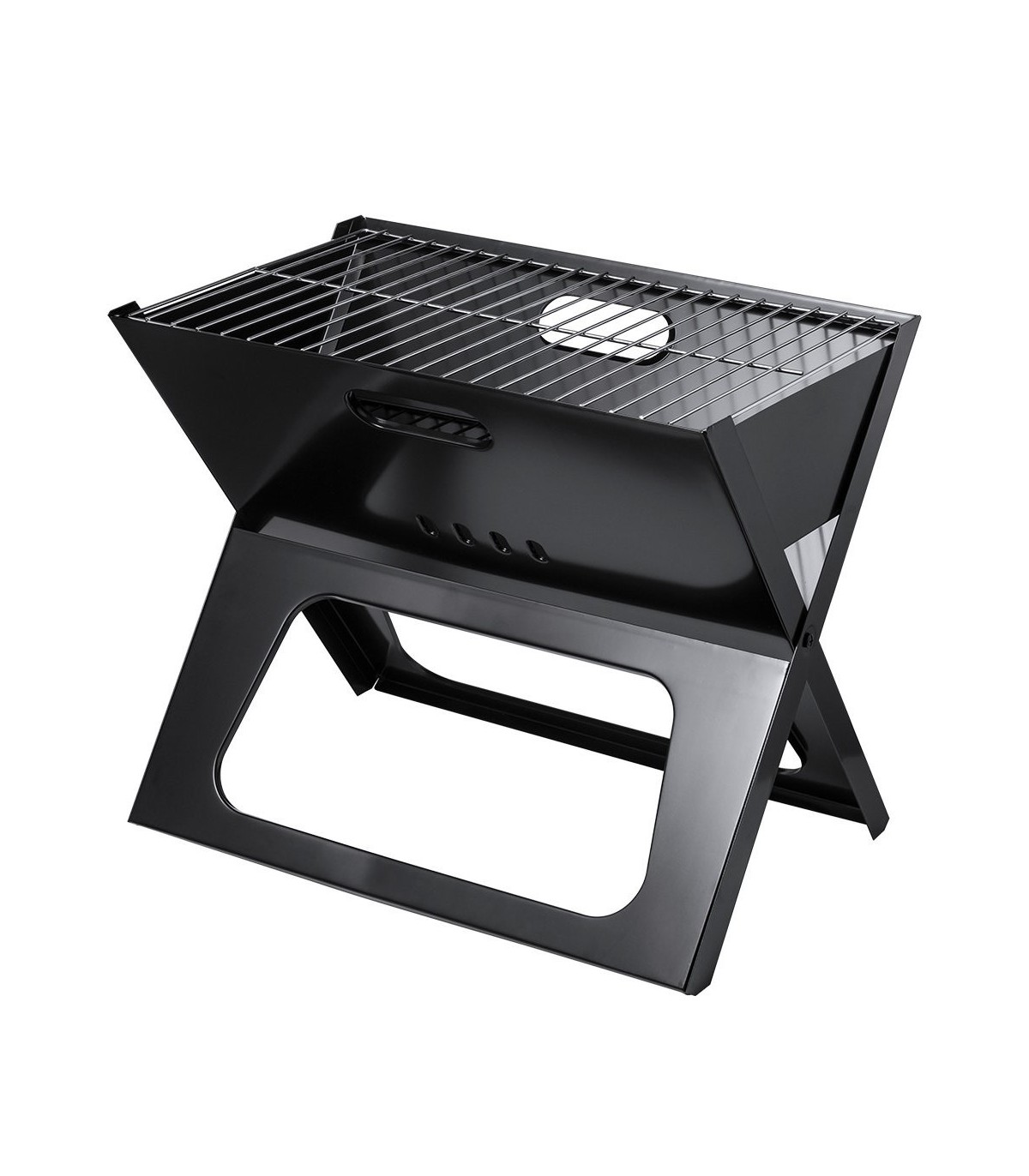 Barbacoa plegable fabricada en resistente metal con cómodas asas y parrilla, de fácil plegado y tamaño compacto. Presentada en atractiva caja individual de diseño.