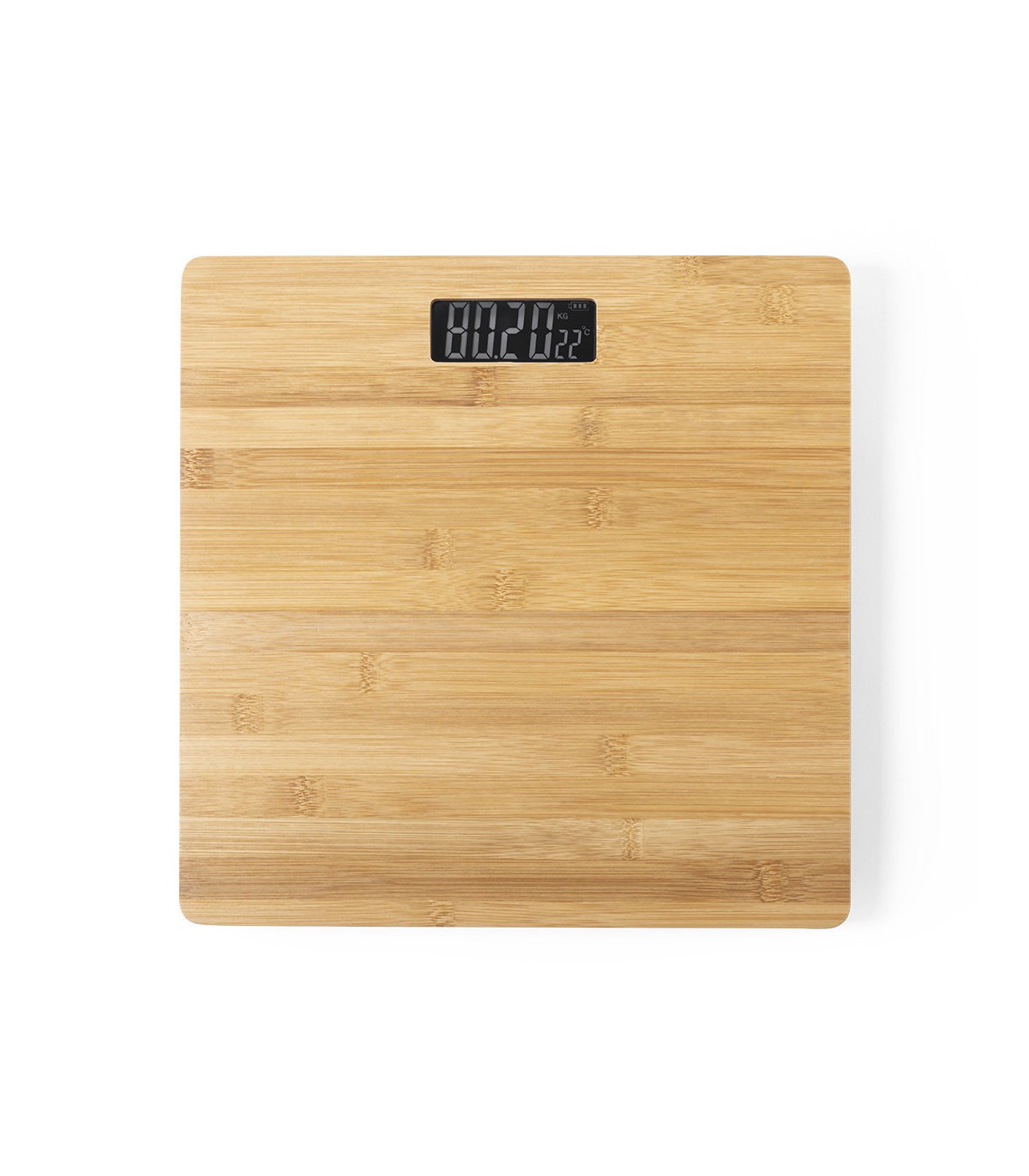 Báscula de fabricación ecológica en bambú, con base antideslizante. Display digital, con funciones de apagado automático, temperatura, tara y selección de unidad de pesaje. Alimentación a pilas (2xAAA no incluidas). Presentada en atractiva caja de diseño eco.