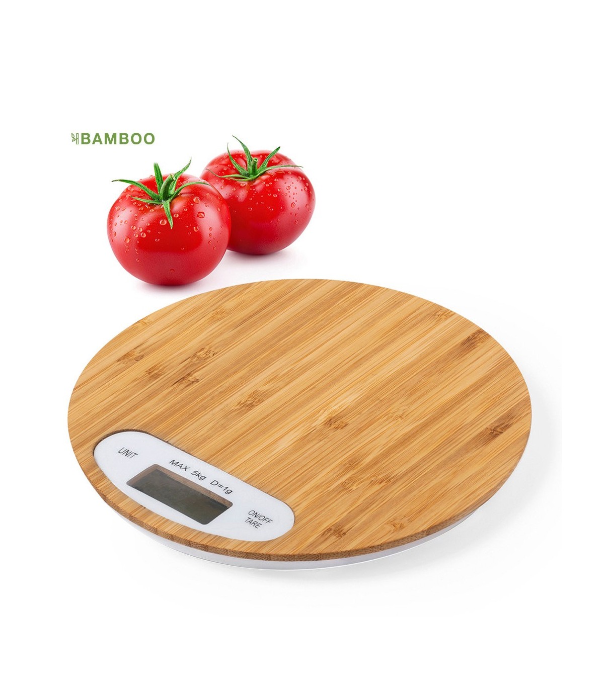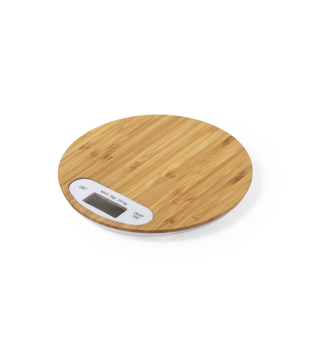 Báscula de cocina de línea nature en bambú pulido. Display digital, con funciones de apagado automático, tara y selección de unidad de pesaje. Alimentación a pilas (de botón incluidas) y peso máximo 5kg. Presentada en atractiva caja de diseño eco.