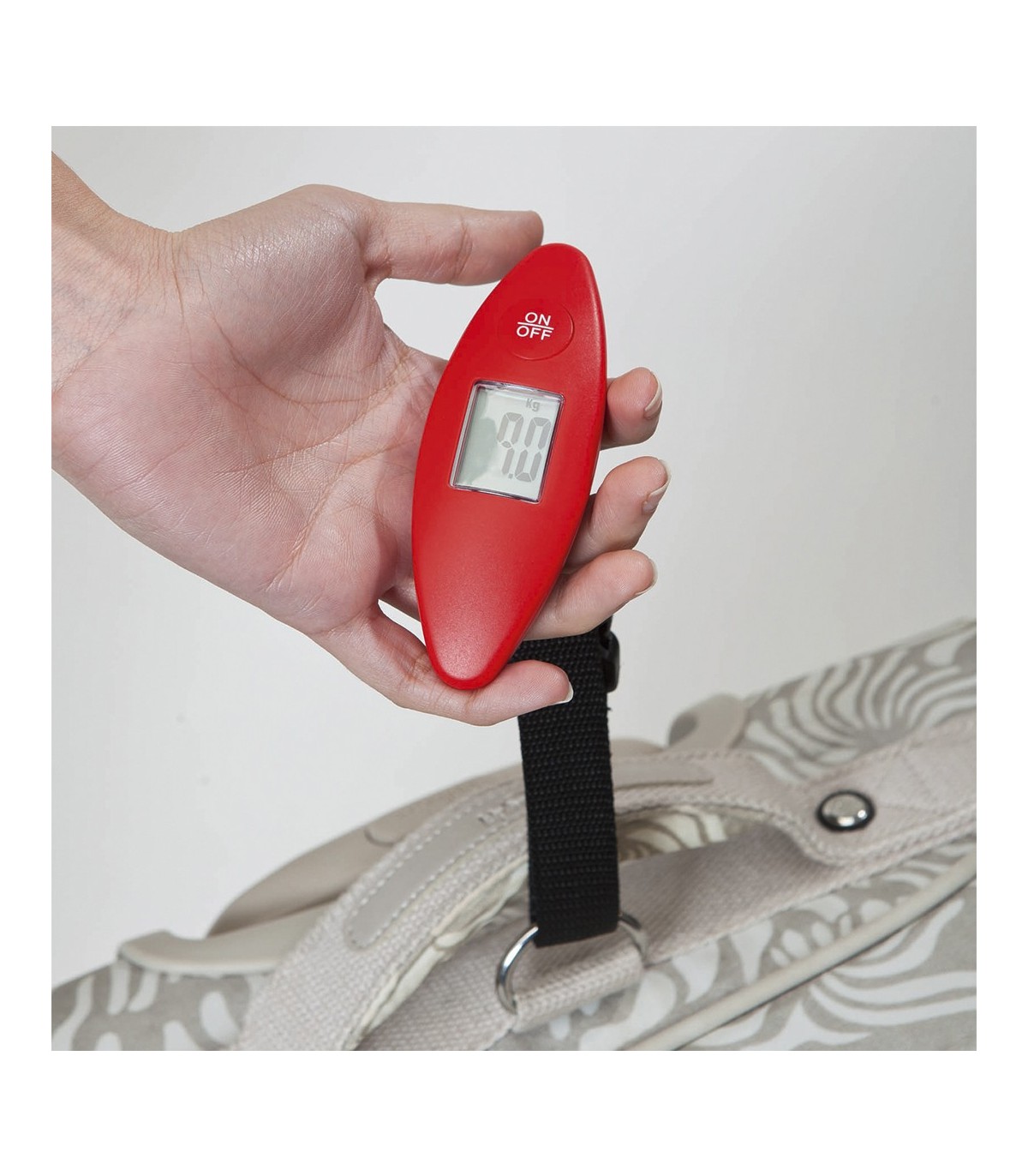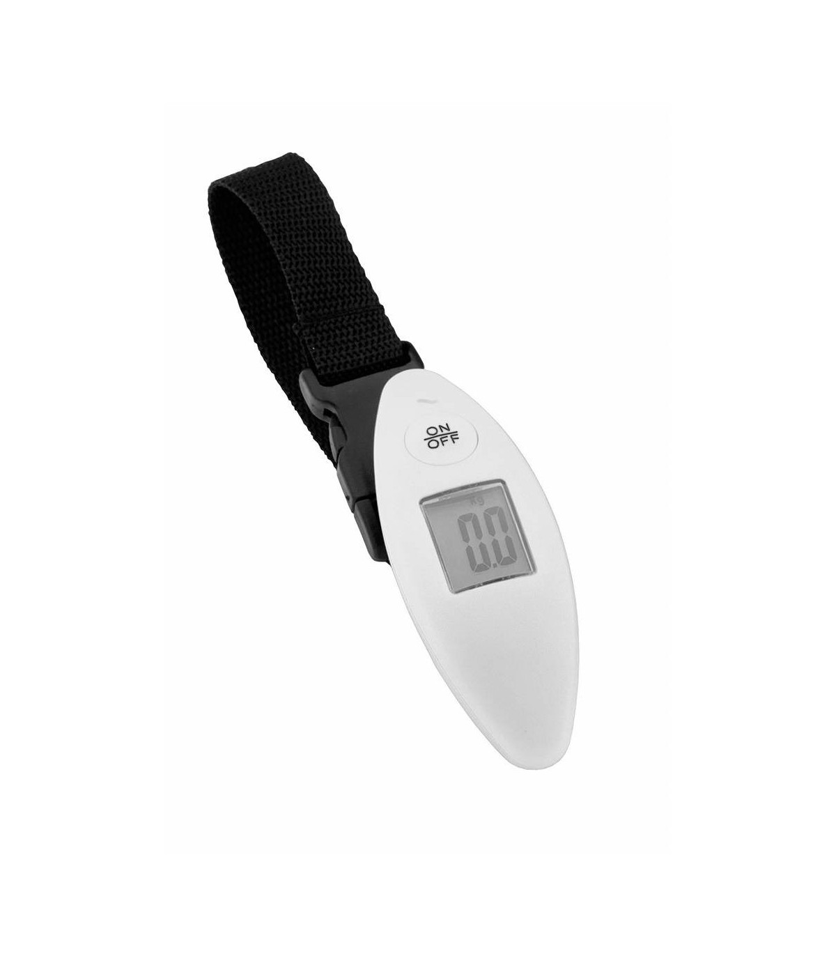 Práctica báscula digital para equipaje en diferentes colores para imprimir con tu logo. Con pila de botón incluida y peso máximo de 40kg.