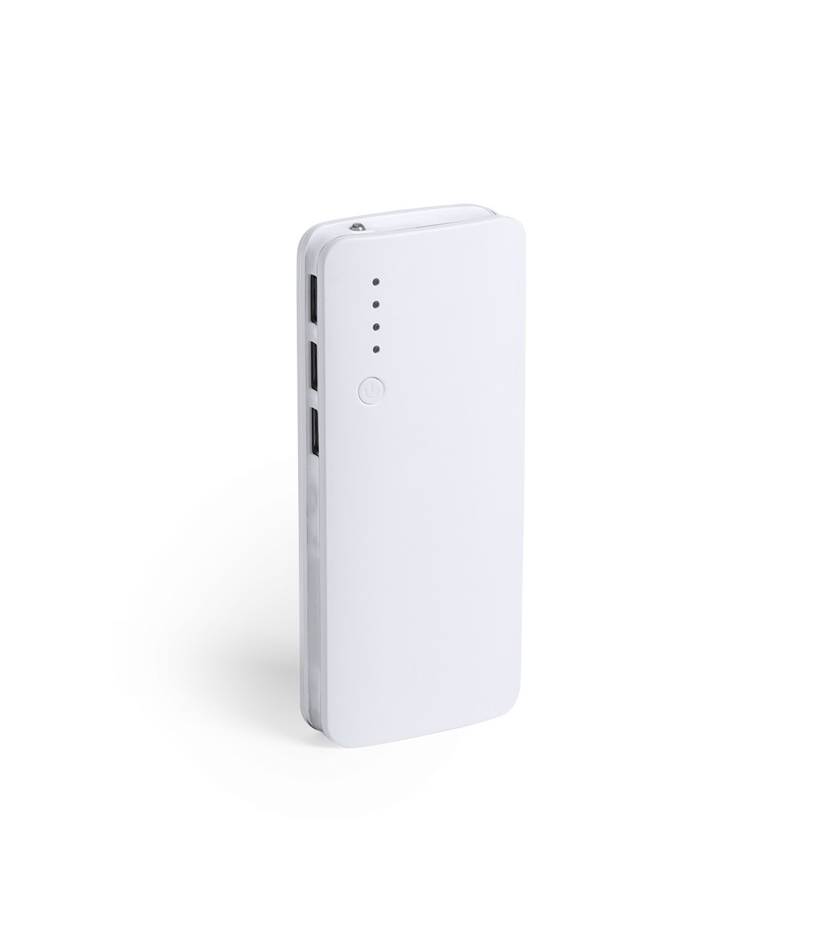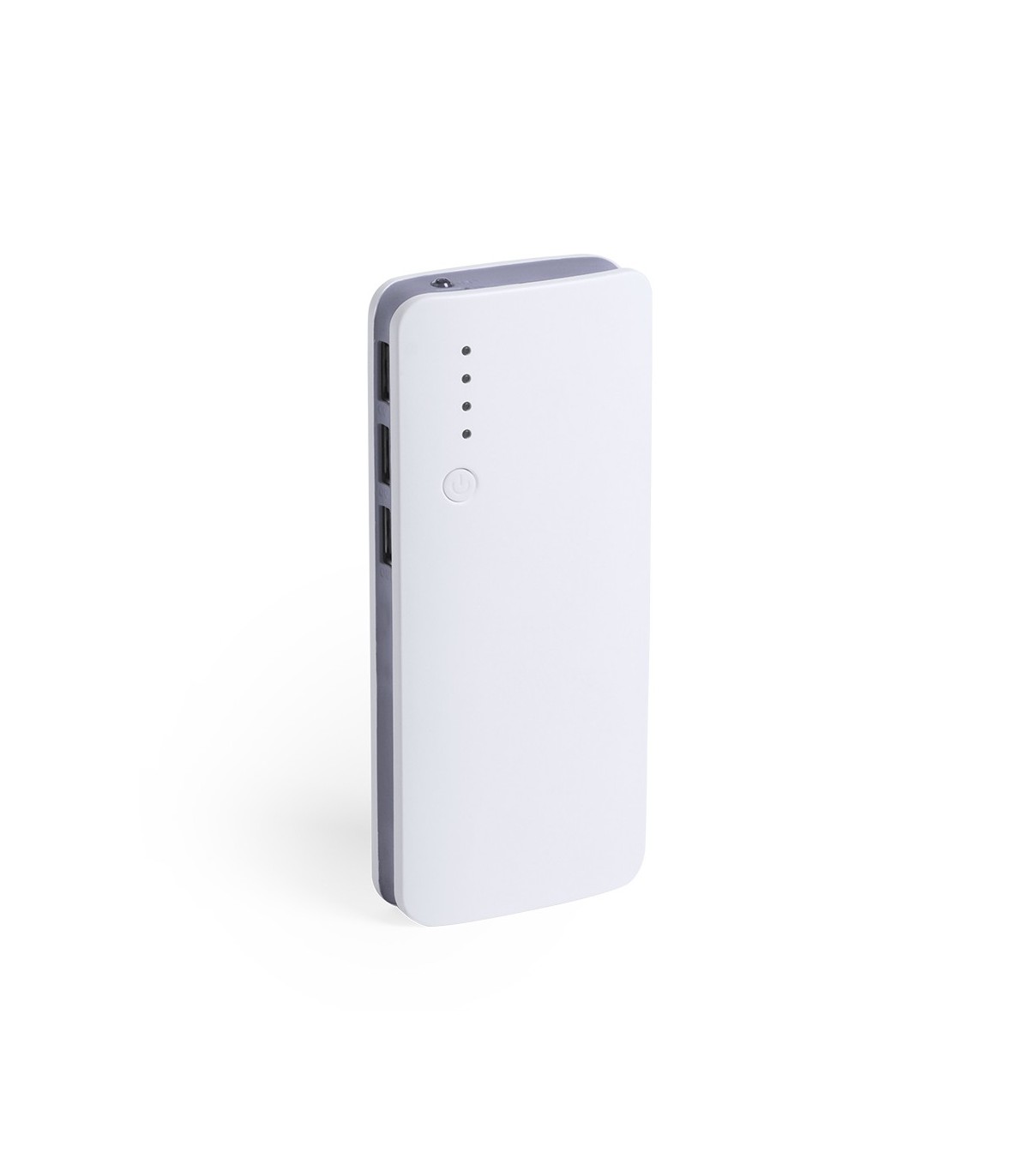 Power bank con carga -10.000 mAh-. Salidas USB triple para cargar hasta 3 dispositivos de forma simultánea, ledes indicadores de estado de carga, diseño curvado con cuerpo en color blanco y laterales en vivos colores.