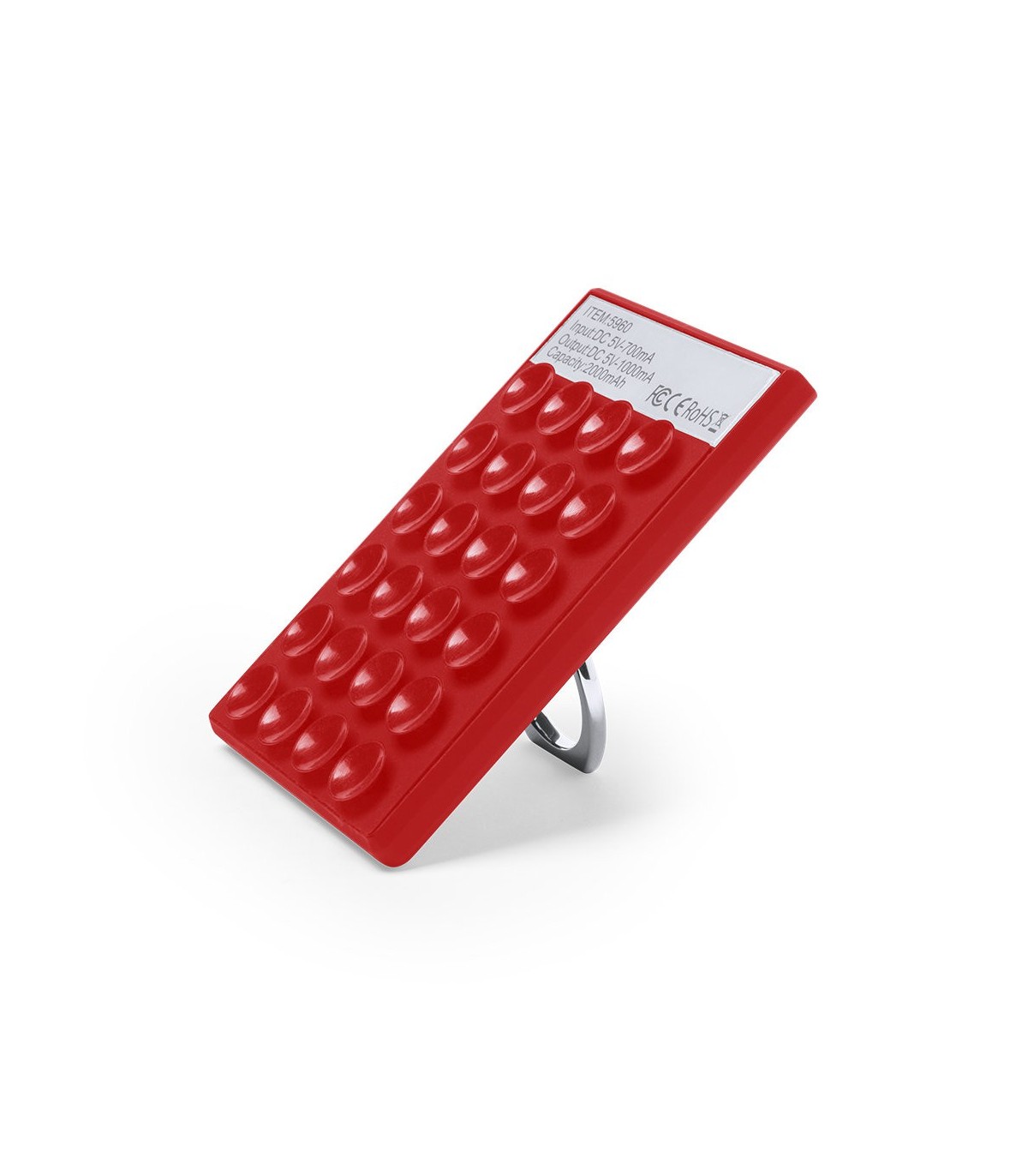 Power bank personalizadas, superficie de ventosas adherentes y anilla/soporte para selfie. Con conexiones para entrada/salida de corriente micro USB y USB.