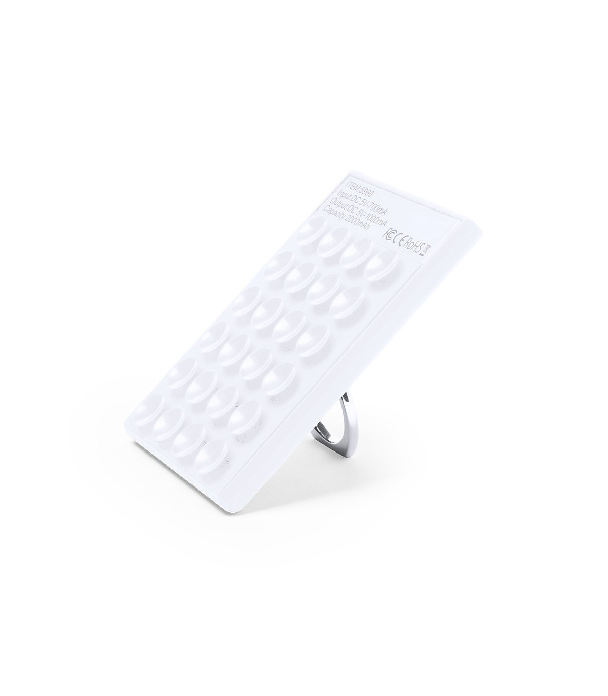 Batería auxiliar externa -2.000 mAh- con superficie de ventosas adherentes y anilla/soporte para selfies. Con conexiones para entrada/salida de corriente micro USB y USB. Ledes indicadores de estado de carga, diseño curvado plano y amplia superficie de marcaje. Presentada en atractiva caja de diseño. Las capacidades mostradas en todas nuestras baterías auxiliares externas son reales, incorporando todas ellas baterías de grado A y no recicladas, con una vida útil de al menos 500 ciclos de carga y según normativa CE. Además, están fabricadas conforme a los estándares RoHS y en cumplimiento con los siguientes requisitos de seguridad: Sistema de protección contra sobrecarga del power bank. Sistema de protección contra descarga completa que proporciona una mayor durabilidad del power bank. Sistema de bloqueo para evitar cortocircuitos. Sistema de transferencia de carga constante, acorde con la capacidad del dispositivo de destino.
