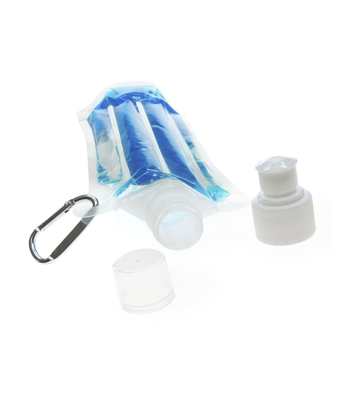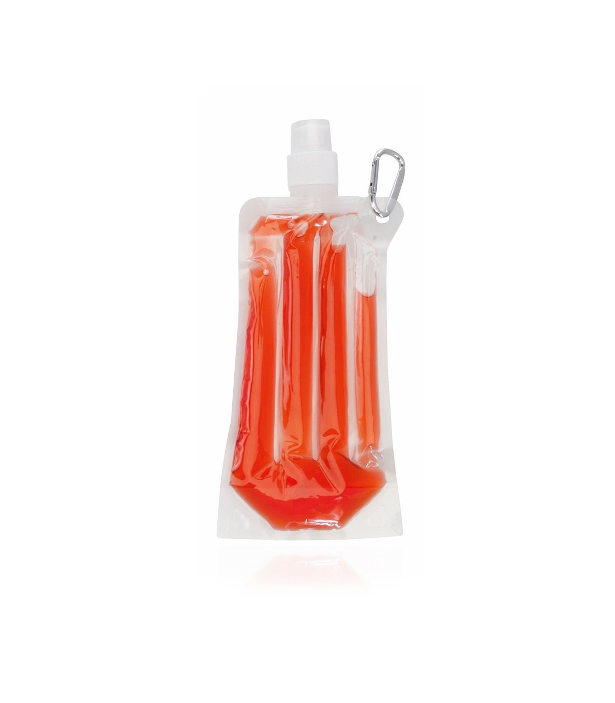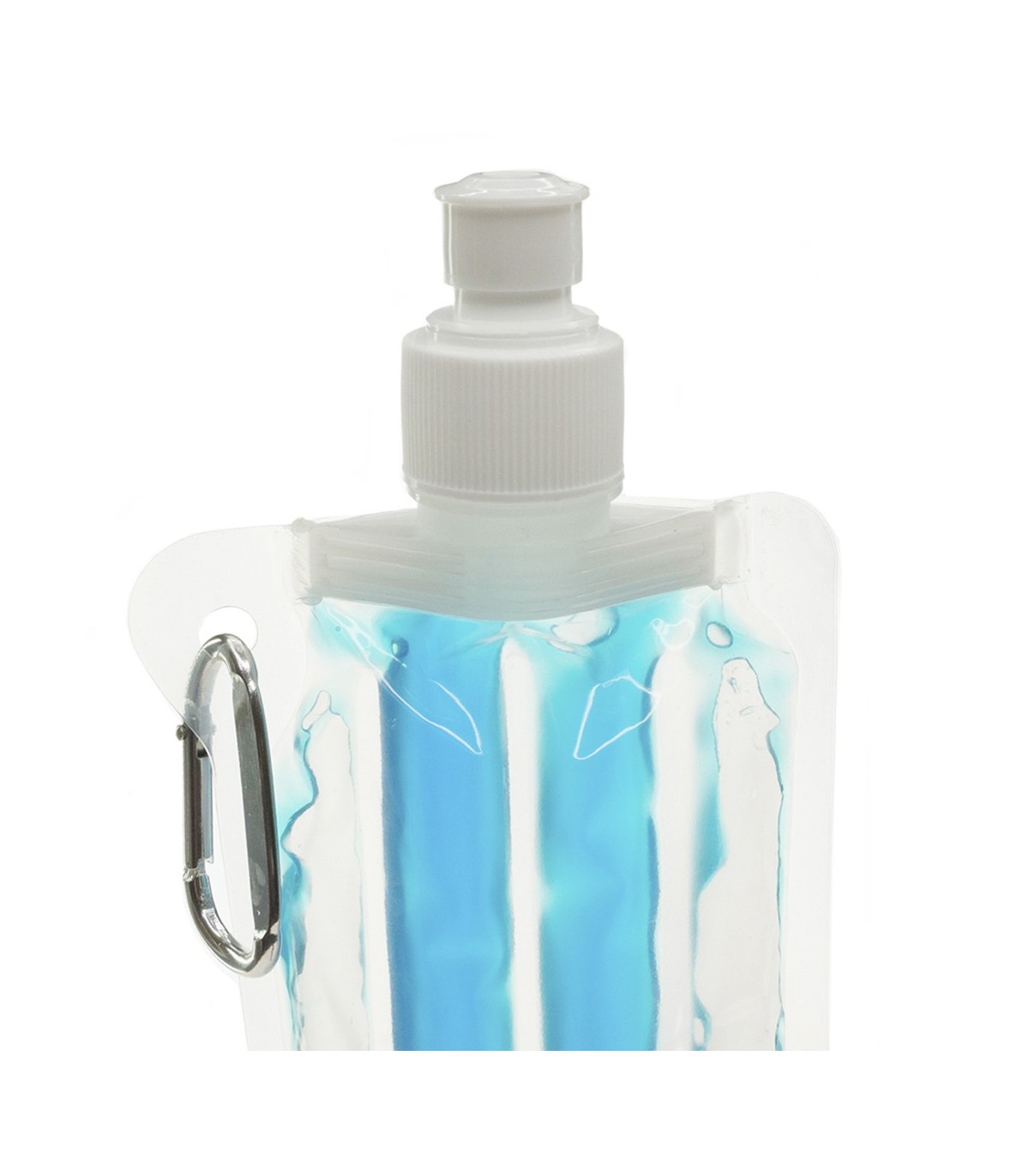 Bidón enfriador de 400ml de capacidad con cuerpo acabado en PET transparente y líquido refrigerante en vivos colores. Con tapón de seguridad a rosca y mosquetón metálico de transporte.