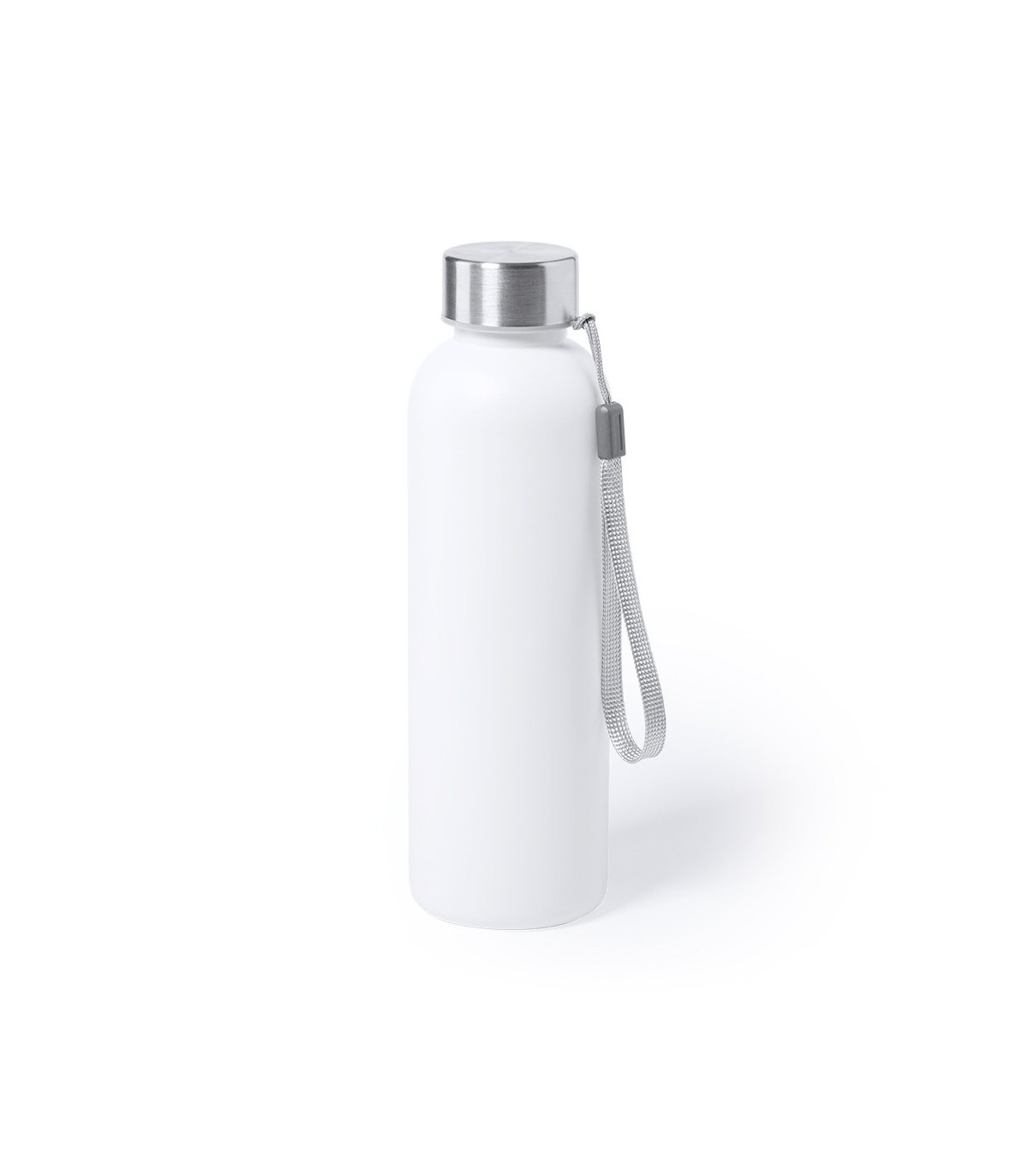 Bidón antibacteriano en polietileno de acabado blanco. 600 ml de capacidad, con tapón en acero inox a rosca -libre de BPA- y cómoda cinta de transporte.