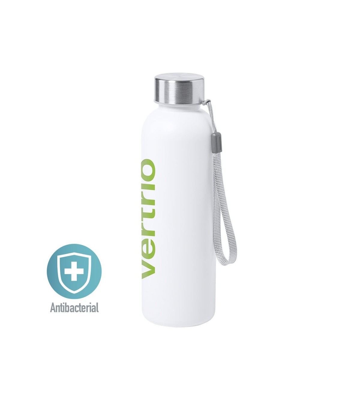 Bidón antibacteriano resistente material PE de acabado blanco. 600 ml de capacidad, con tapón en acero inox a rosca -libre de BPA- y cómoda cinta de transporte. Los productos con tratamientos antibacterianos son capaces de reducir drásticamente las cargas bacterianas presentes en las superficies de los materiales, gracias a la incorporación de agentes microbianos permanentes estáticos, con alta efectividad para inhibir y prevenir la contaminación bacteriana. Artículo de acuerdo al estándar ISO 22196, que determina la actividad antibacteriana en materiales plásticos y superficies no porosas, lo que permite conocer la efectividad de inhibición microbiana que tienen los aditivos sobre los objetos tratados mediante una evaluación cuantitativa.