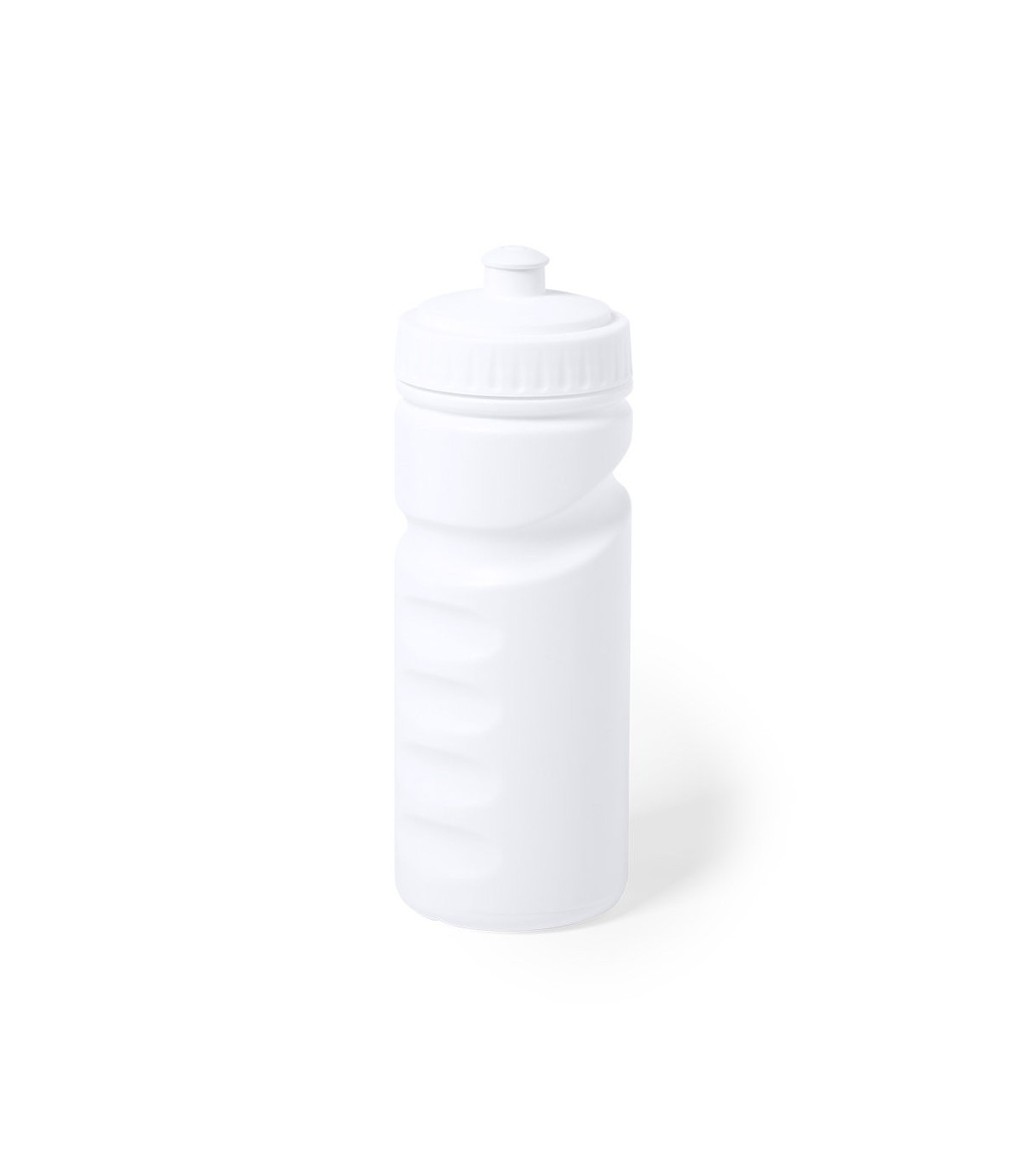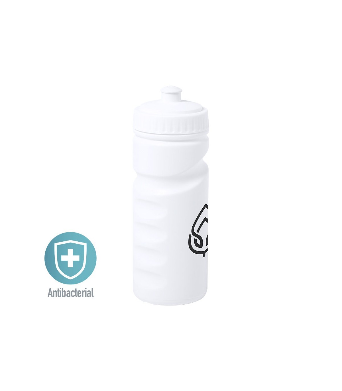Bidón antibacteriano en Polietileno Tereftalato de color blanco, libre de BPA. 500ml de capacidad, con cuerpo ergonómico, tapón a rosca y dosificador de seguridad.
