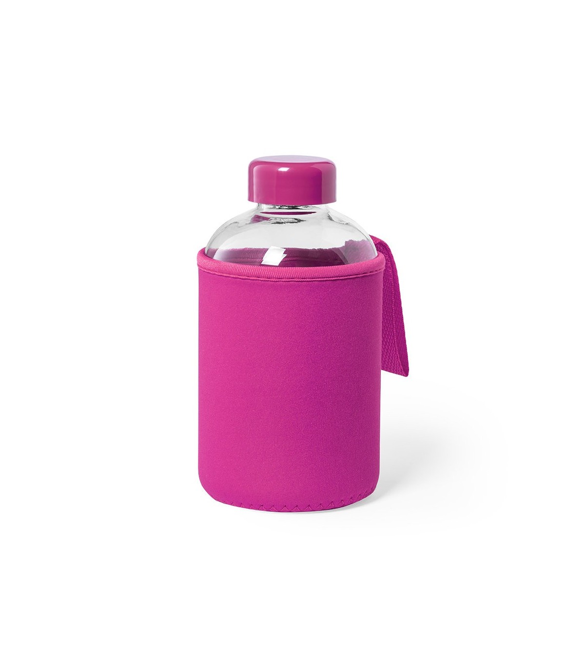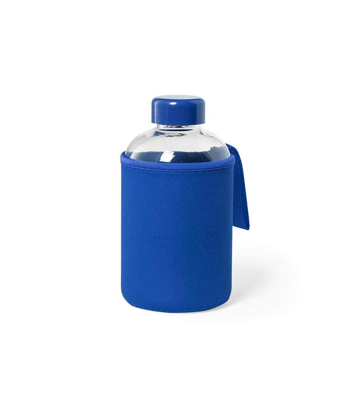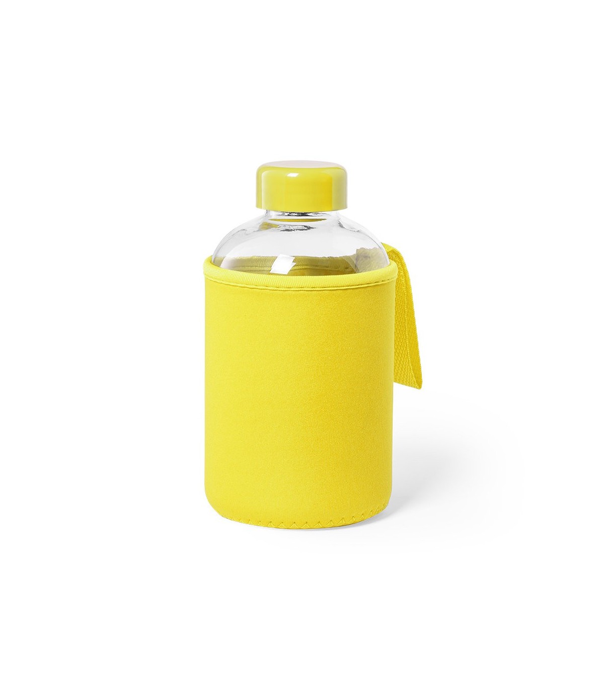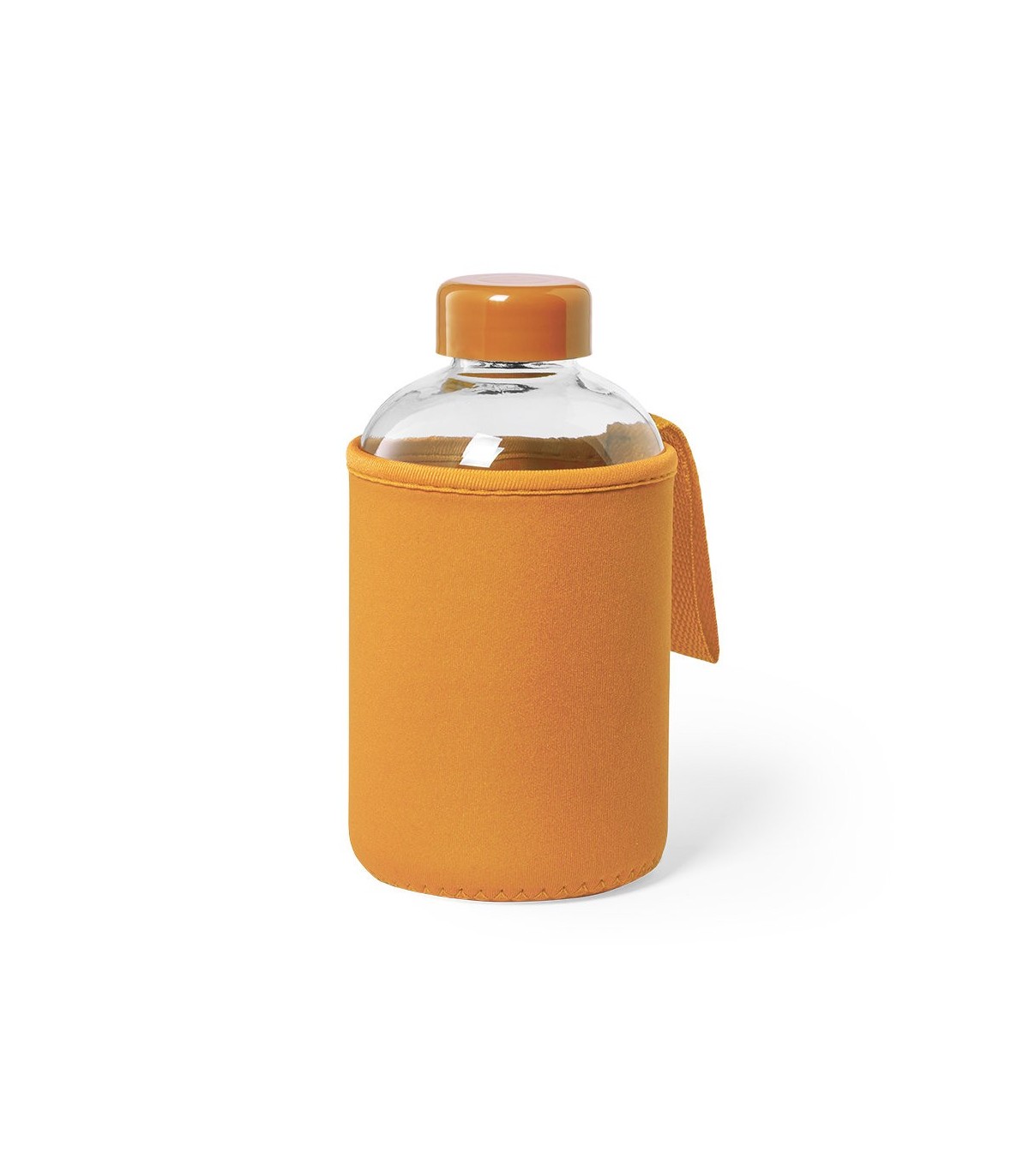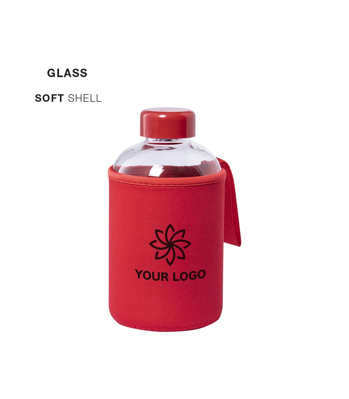 Bidón de 600ml de capacidad. Fabricado con cuerpo de cristal y tapón a rosca. Incluye funda de soft shell a juego, con asa de transporte. Disponibles en varios colores para personalizar, y viene Presentacion en embaleje individual de atractivo diseño.