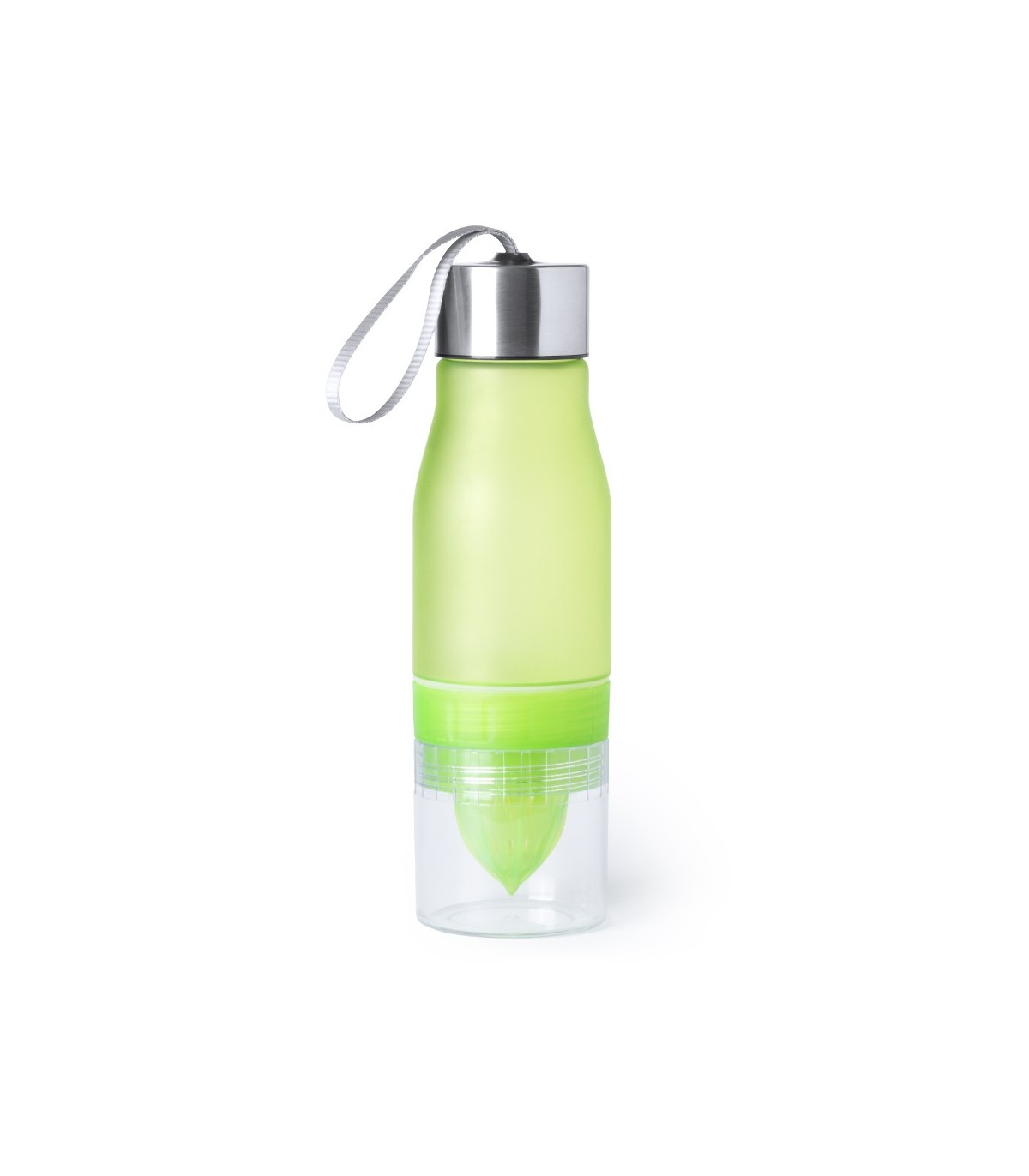 Original bidón de 700ml de capacidad en material tritán de resistencia al calor (70º) y libre de BPA en variada gama de vivos colores. Incluye compartimento en base con exprimidor de cítricos para dar sabor al agua. Con dosificador, tapón a rosca y cinta de transporte. Presentacion en embaleje individual.