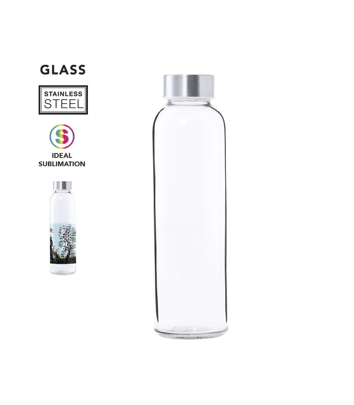 Bidones transparente de cristal de 500 ml de capacidad, especialmente diseñado para marcaje en sublimación. Con tapón a rosca en acero inox, libre de BPA. Embalado en original caja de diseño.