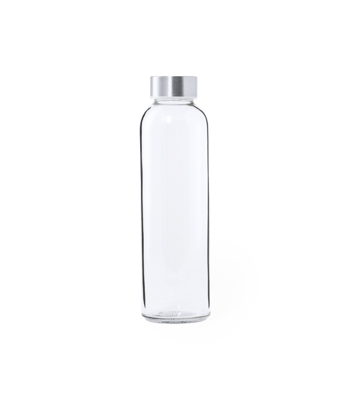Bidones personalizados en color transparente de cristal y 500 ml de capacidad, con tapón a rosca en acero inox, libre de BPA.
