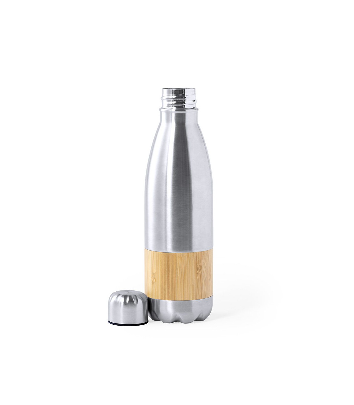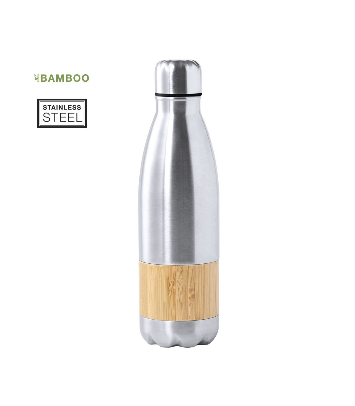 Bidones ecológicos personalizados y hechos en combinación de materiales acero inox de acabado mate y bambú. 750ml de capacidad, con tapón de seguridad.