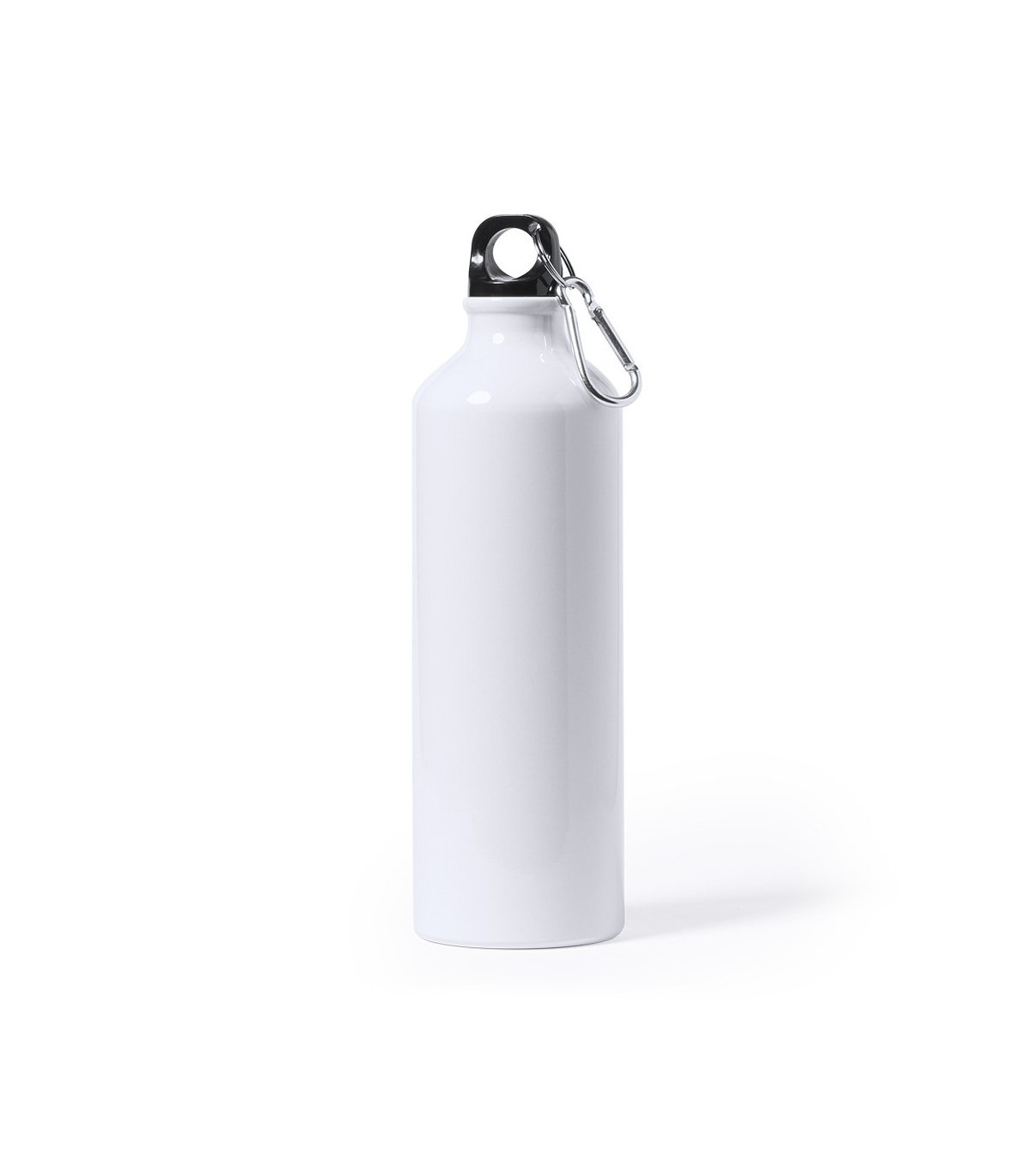 Bidones de aluminio en suave y brillante color blanco, especialmente diseñado para marcaje en sublimación. Con tapón de seguridad a rosca y mosquetón metálico de transporte.