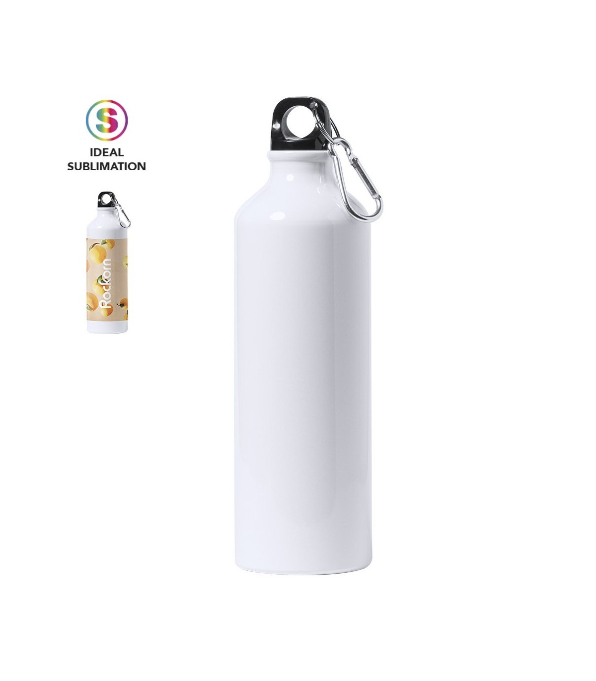 Bidones de aluminio de 800ml de capacidad. Acabado en suave y brillante color blanco, especialmente diseñado para marcaje en sublimación. Con tapón de seguridad a rosca y mosquetón metálico de transporte. Embalado en original caja de diseño.