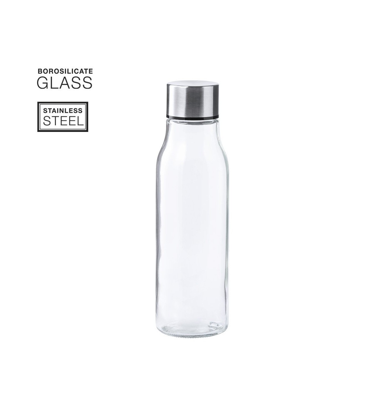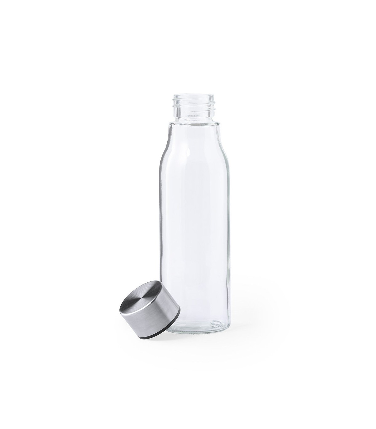 Bidones de 550ml de capacidad. Hecho en cristal de borosilicato, con tapón en acero inox, libre de BPA. Para personalizar con tu logo de empresa.