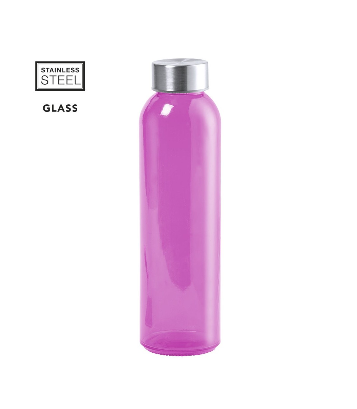 Bidón de cristal en alta calidad, de 500ml de capacidad, con cuerpo de acabado transparente en material libre de BPA y tapón a rosca en acero inox. Disponibles en varios colores para personalizar. presentado individualmente en caja de diseño.